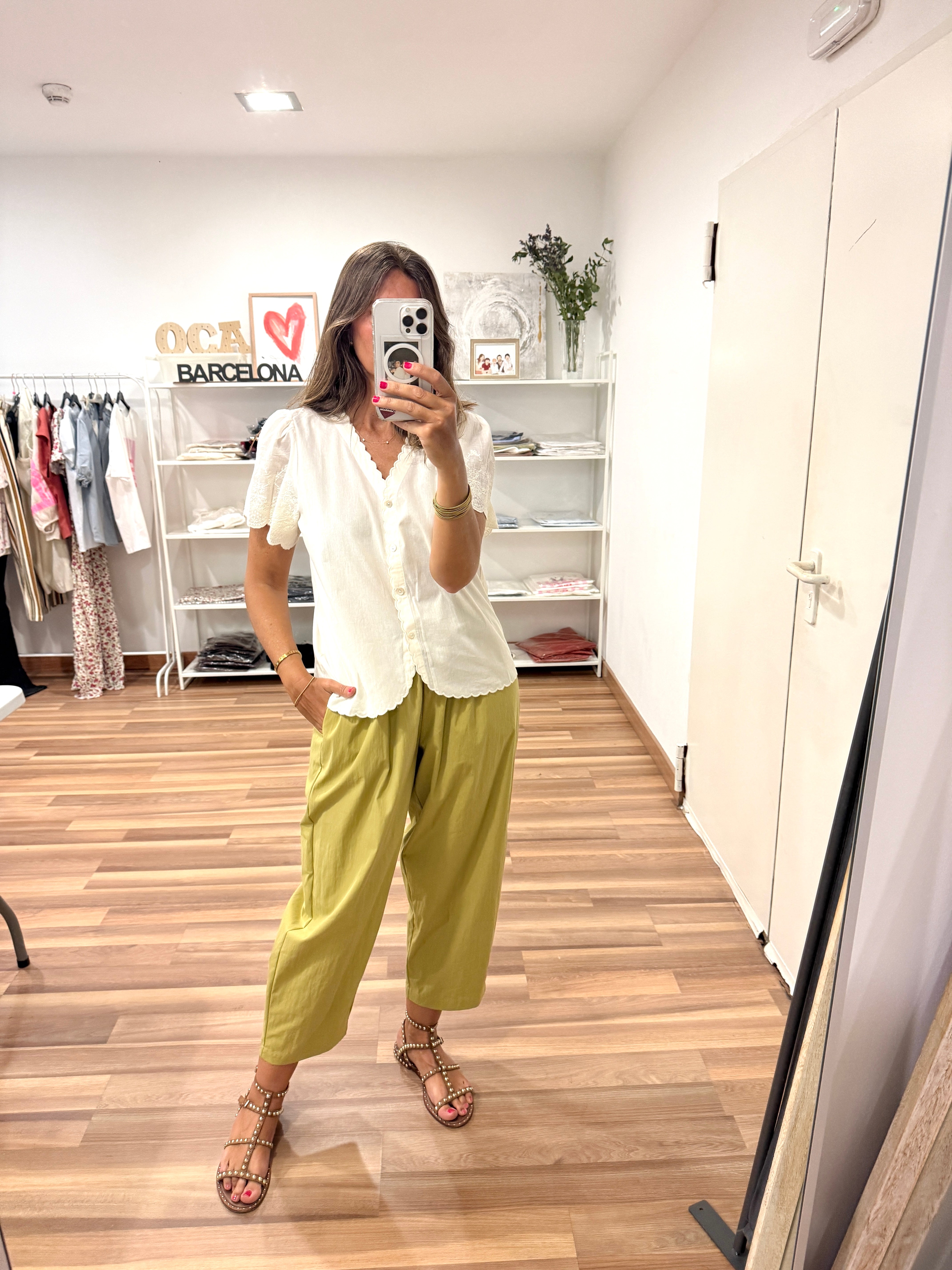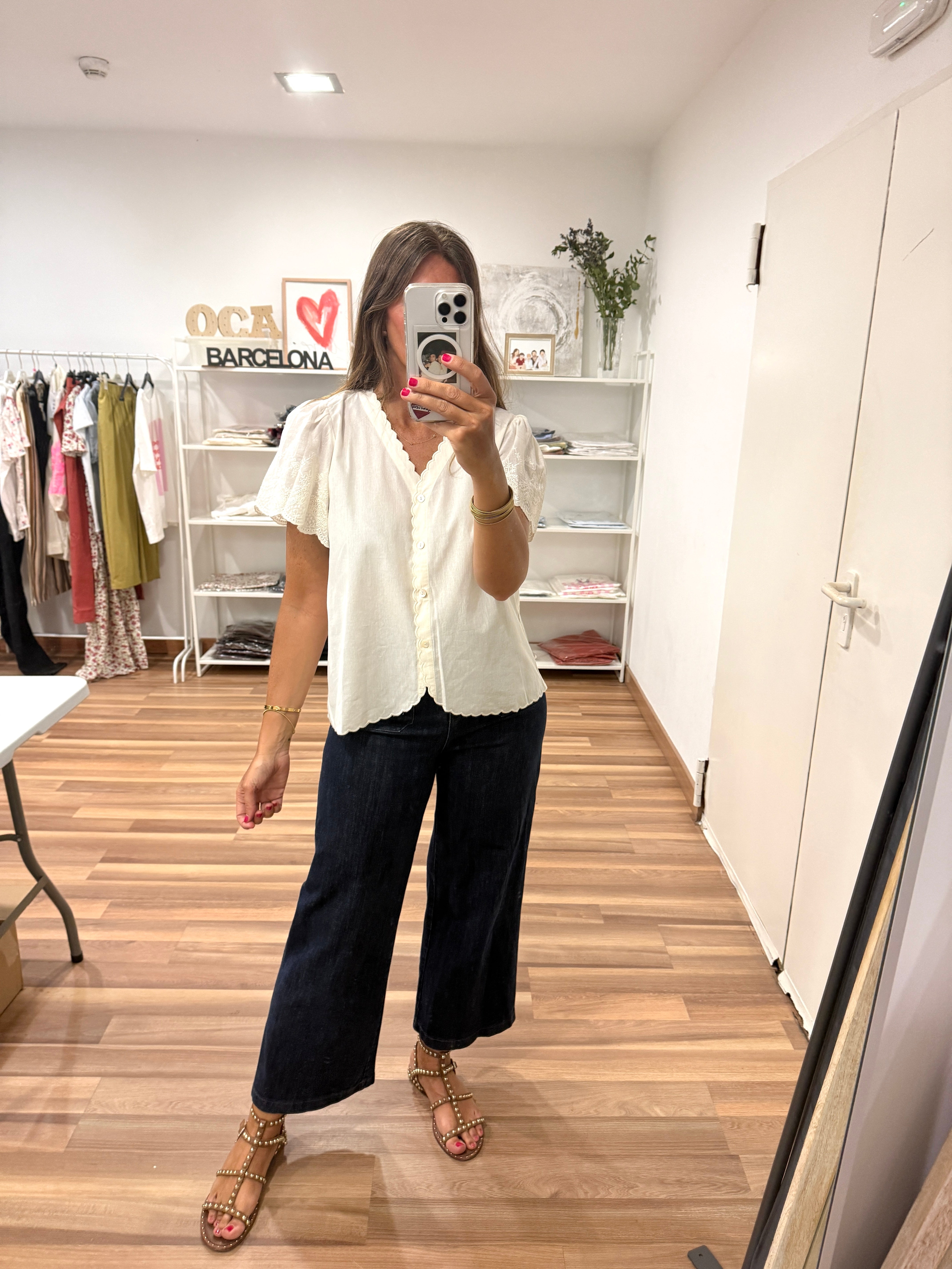 Blusita de color blanco roto con detalles encaje en mangas y costuras con forma.