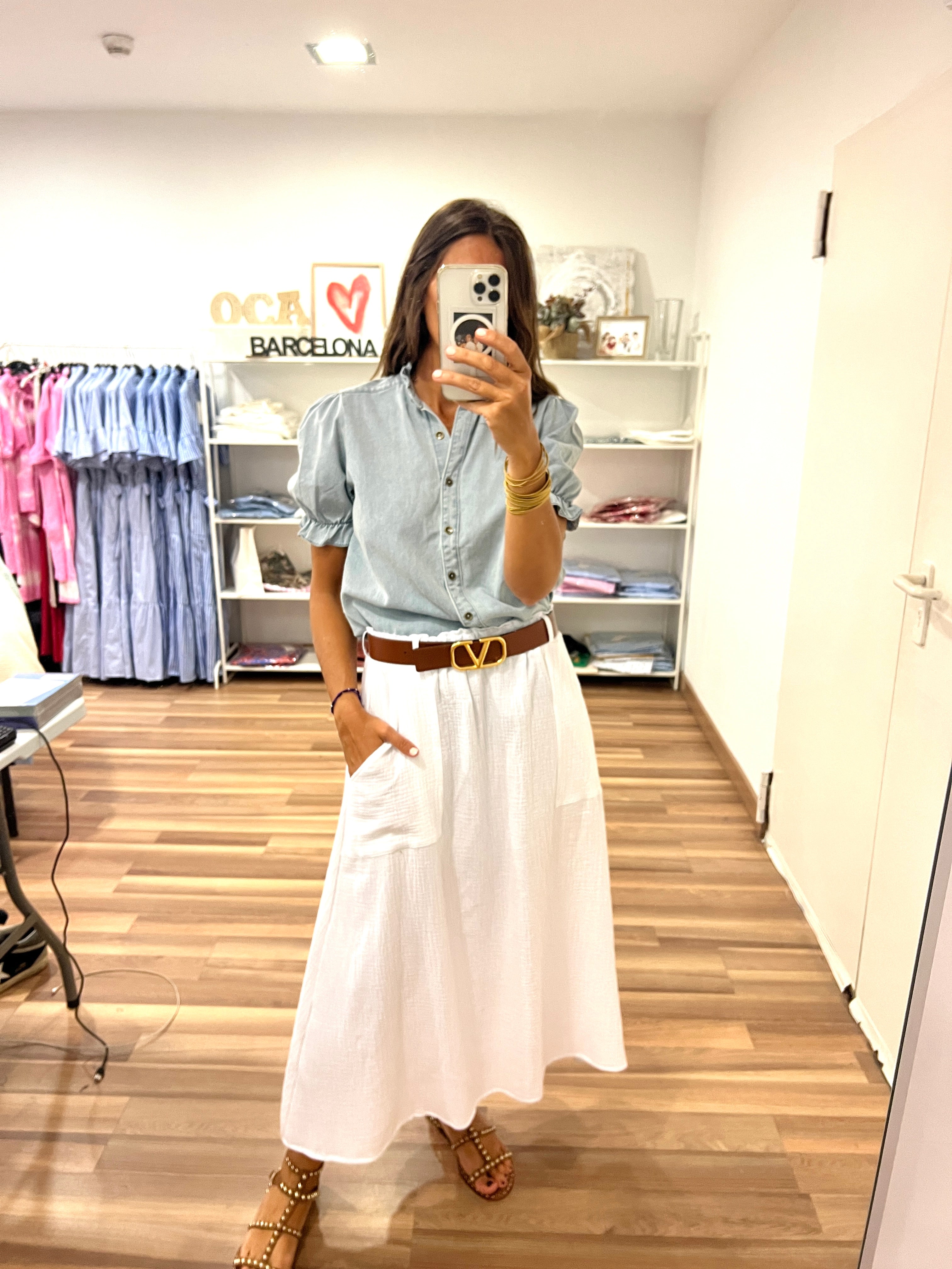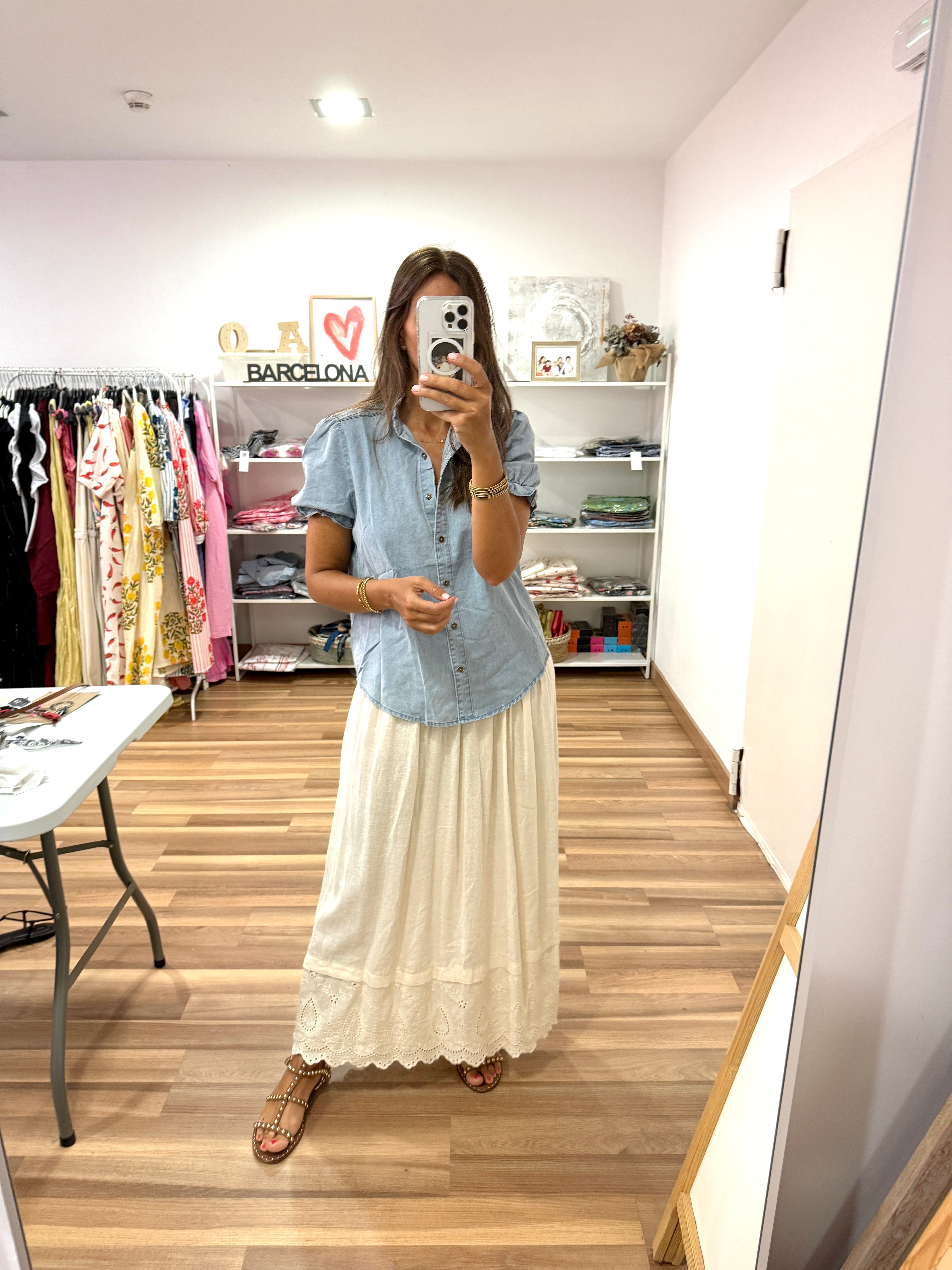 Blusa denim con goma en manguitas y detalle de volantito en maguita y cuello.