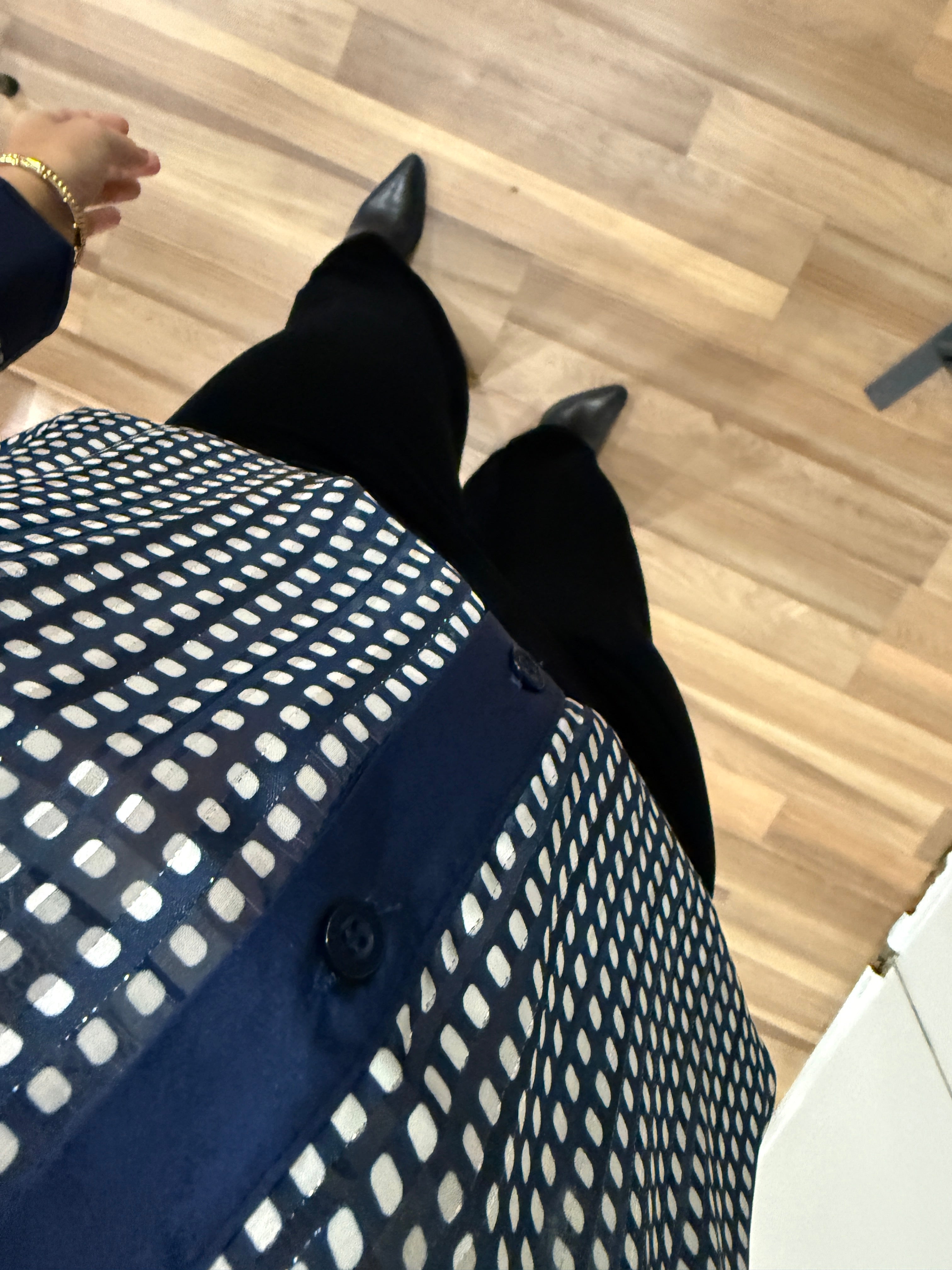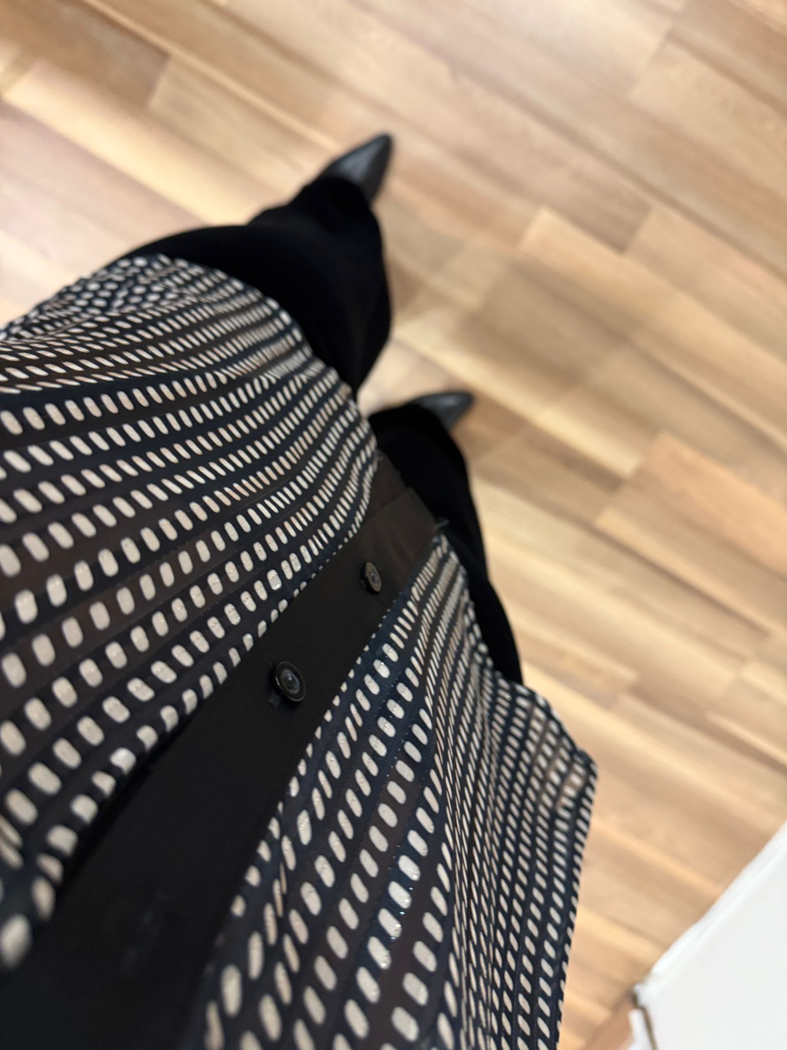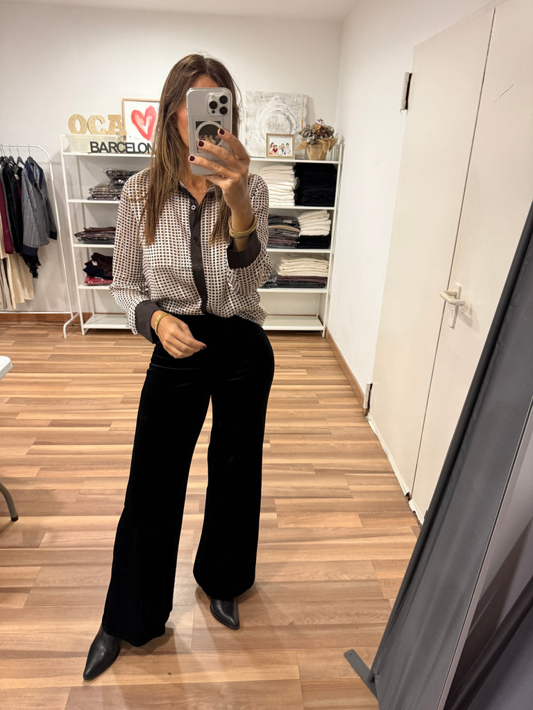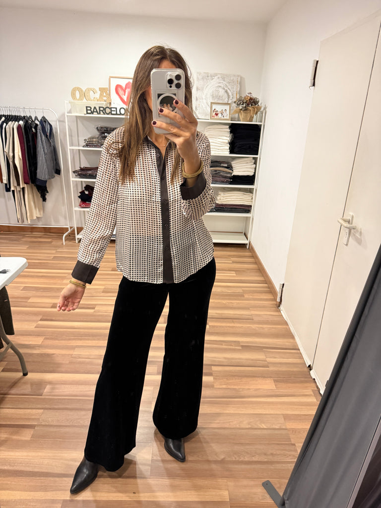 Blusa estampada con transparencia, manga larga, abotonada, cuello camisero y detalle de brillo. Talla única