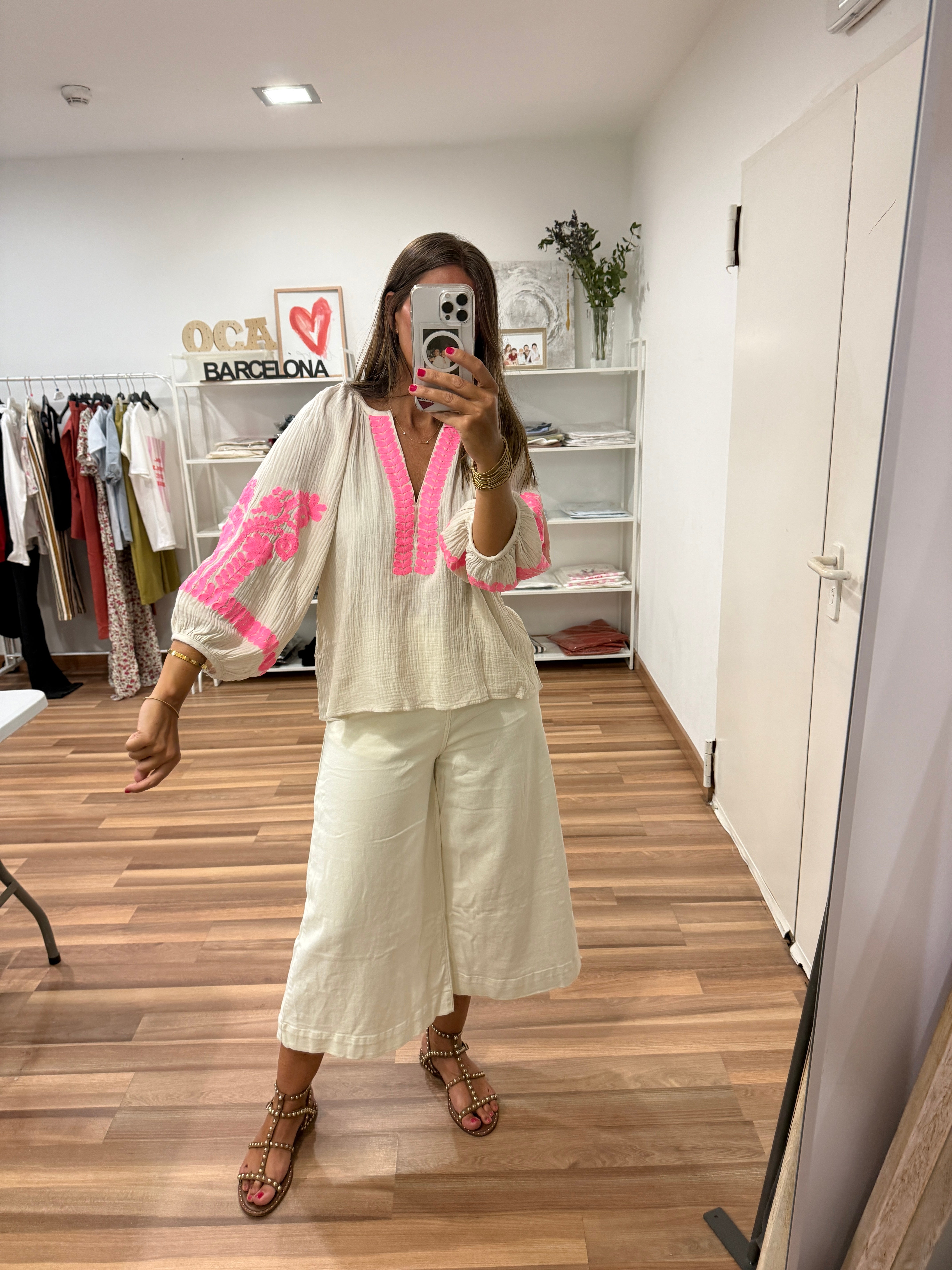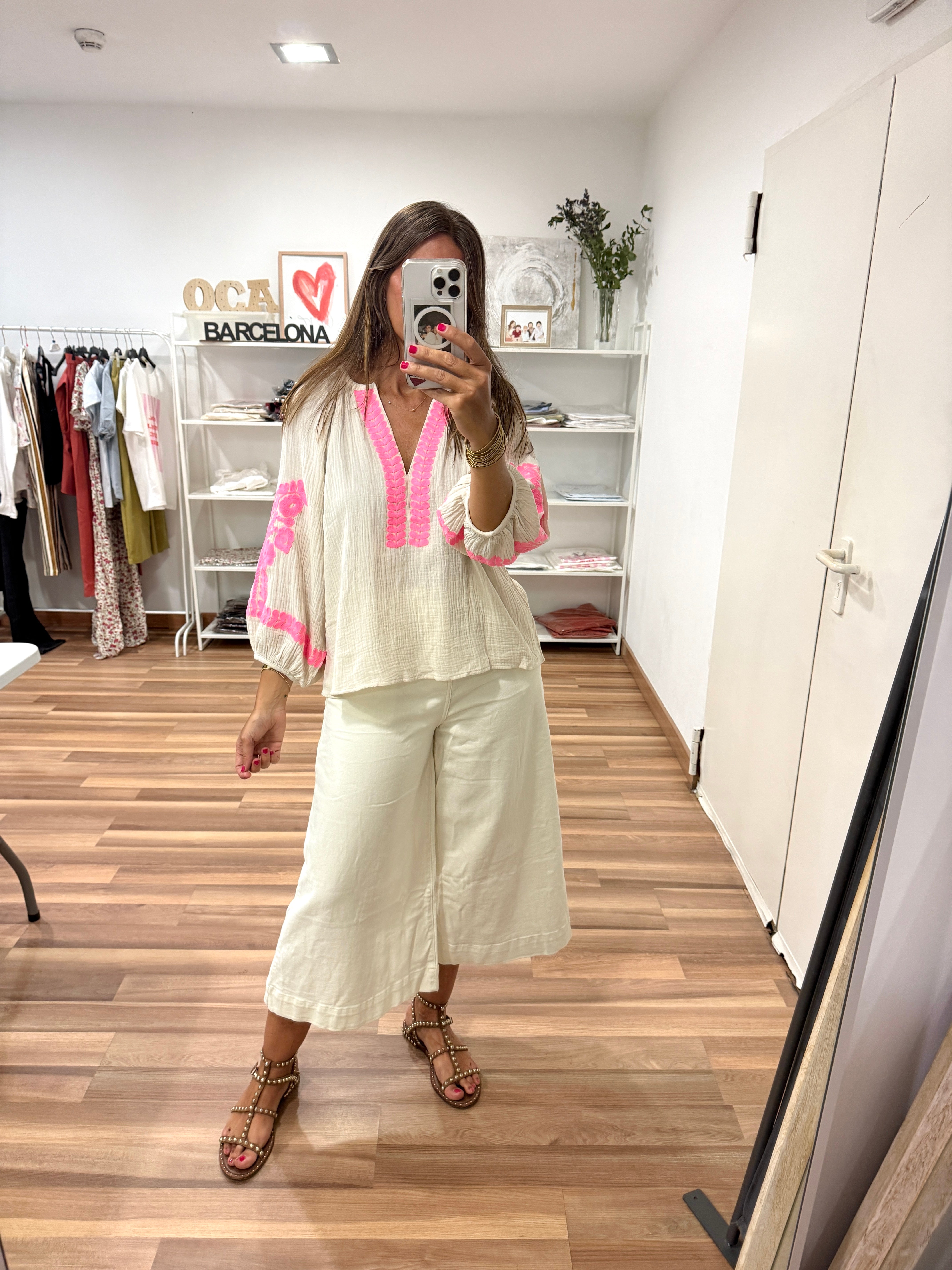 Blusita de color beige muselina con detalle encaje en rosa fluor. Mangas abullonadas y cuello en V.