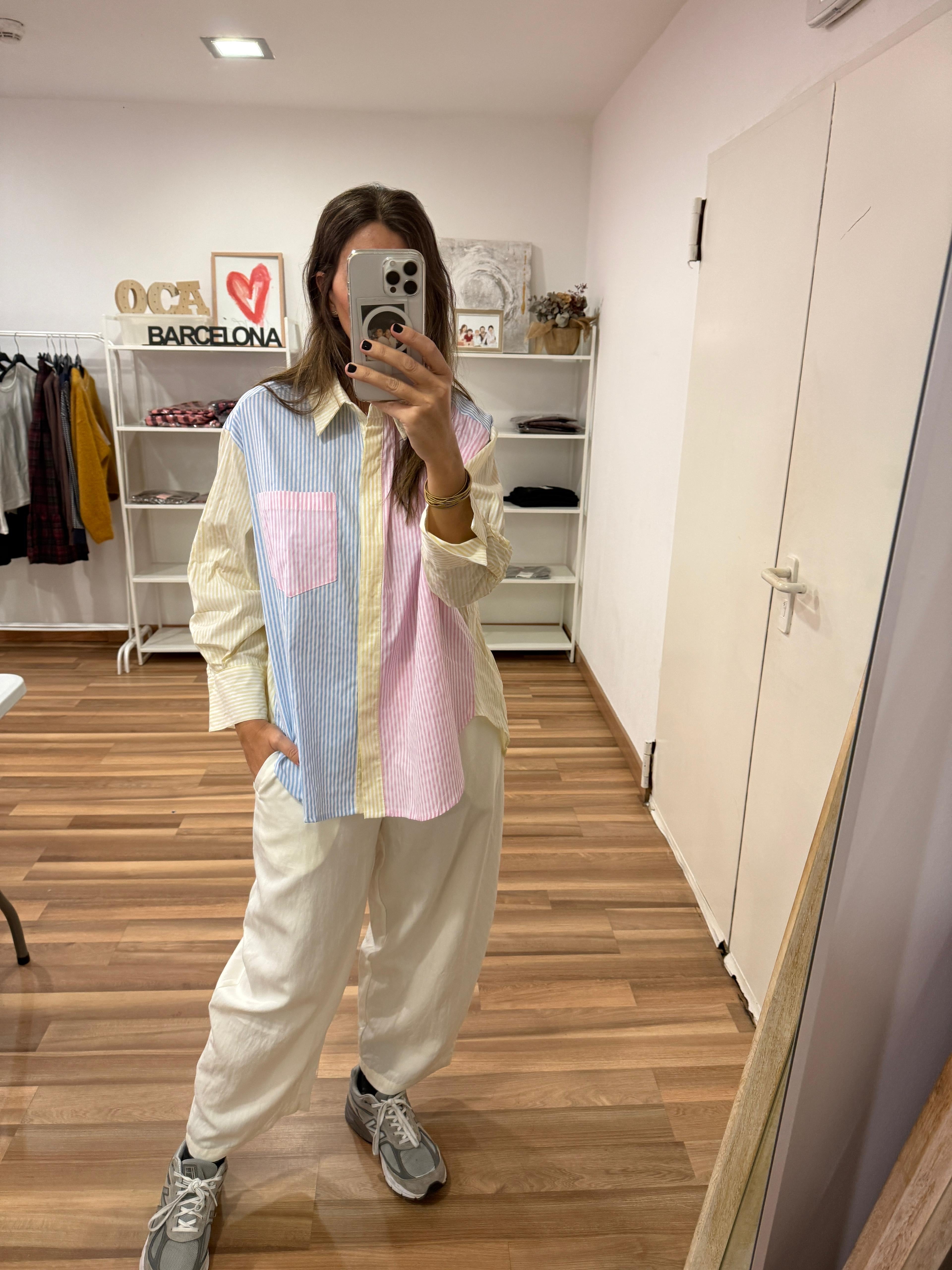 Camisa a rayas de colores (azul, amarillo y rosa), más larga por detrás que por delante. Bolsillo lateral pecho. Oversize.