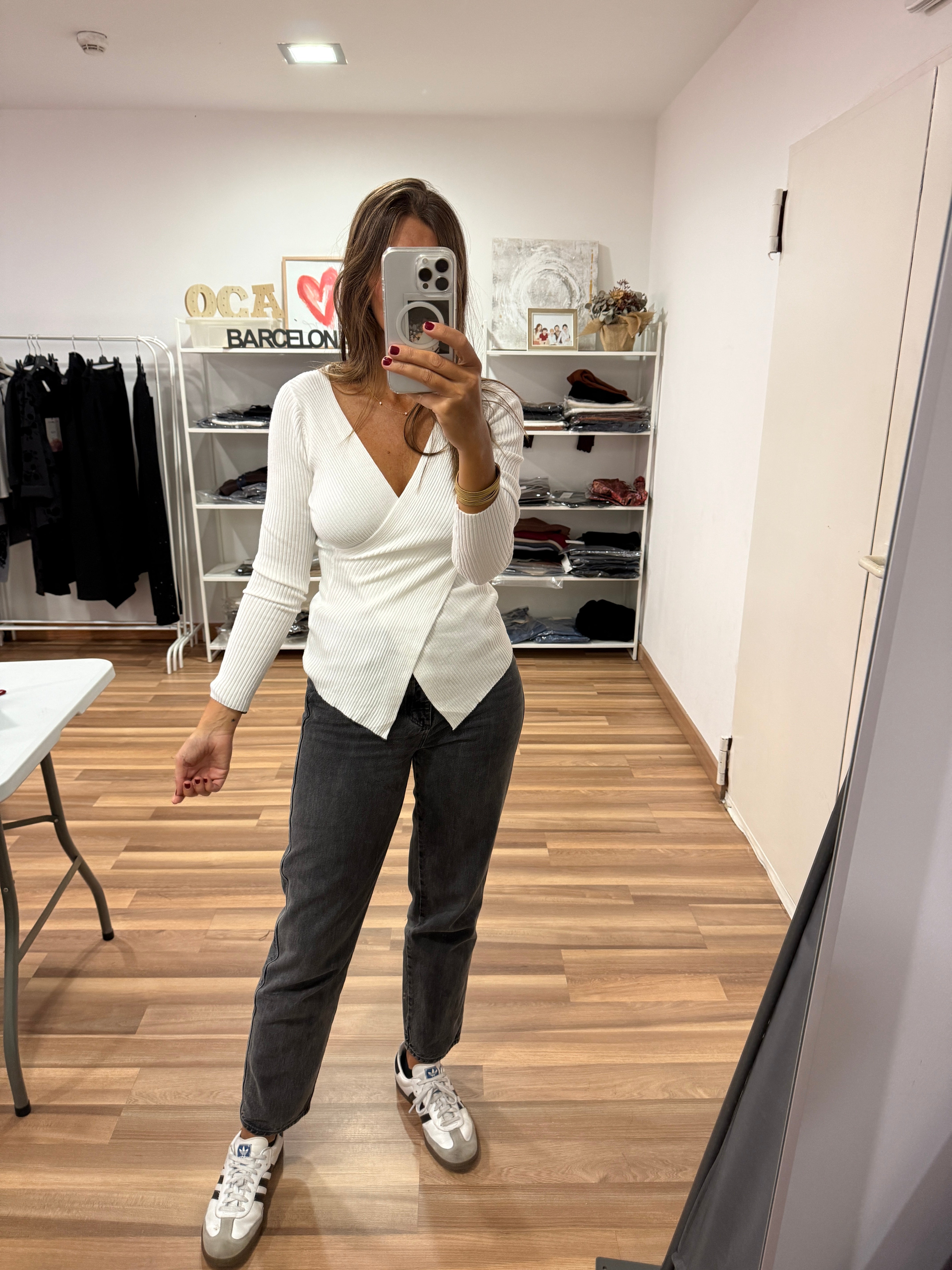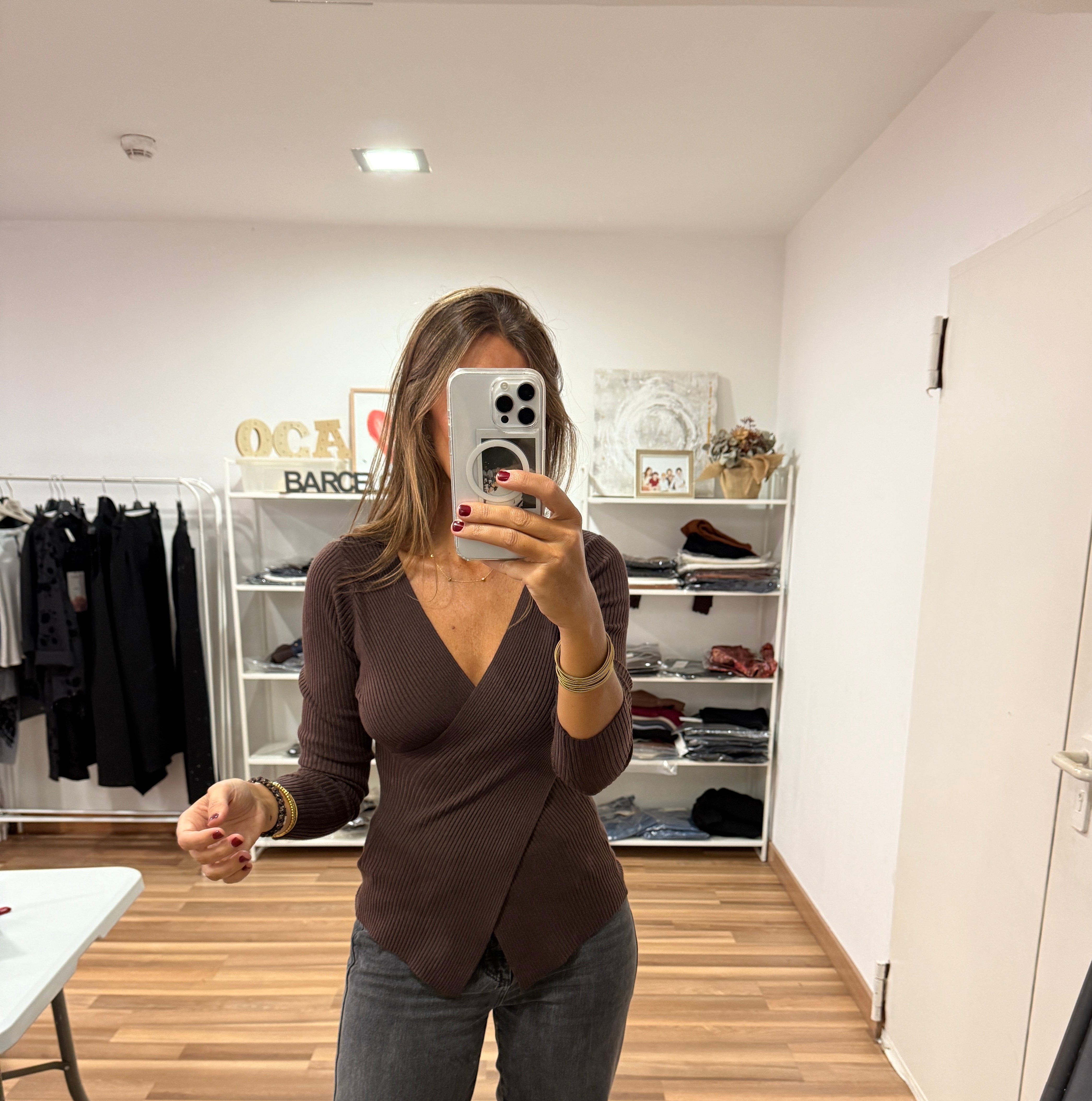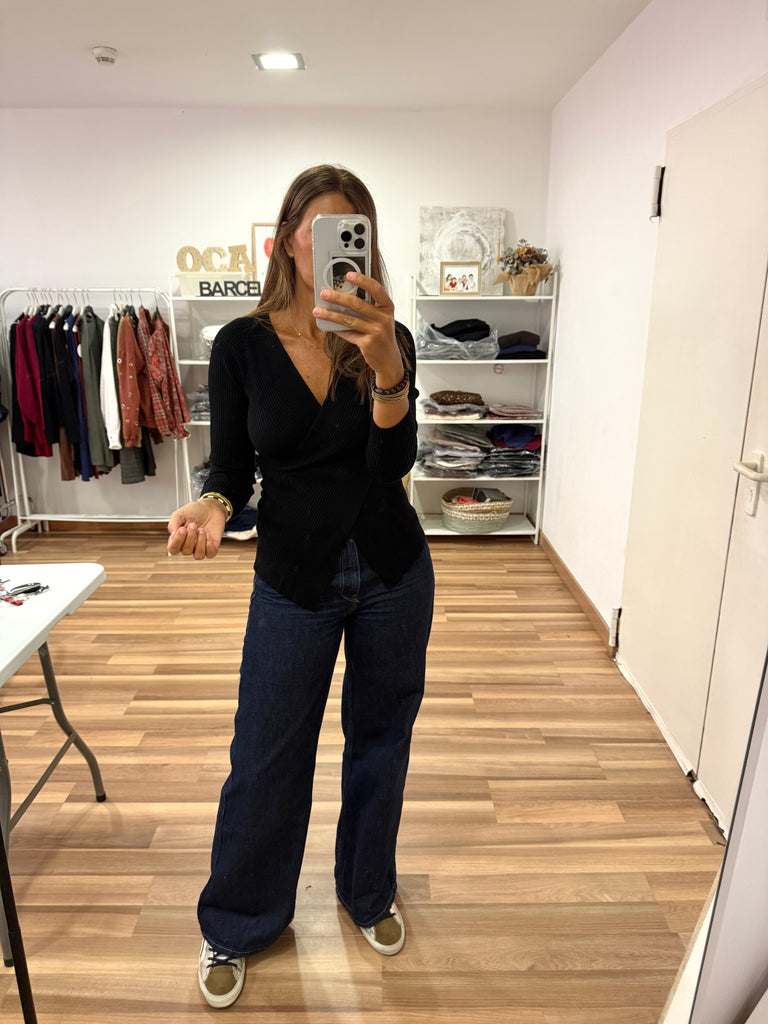 Cuerpo gustoso de canalé negro, manga larga, con escote pico y detalle de cruce.