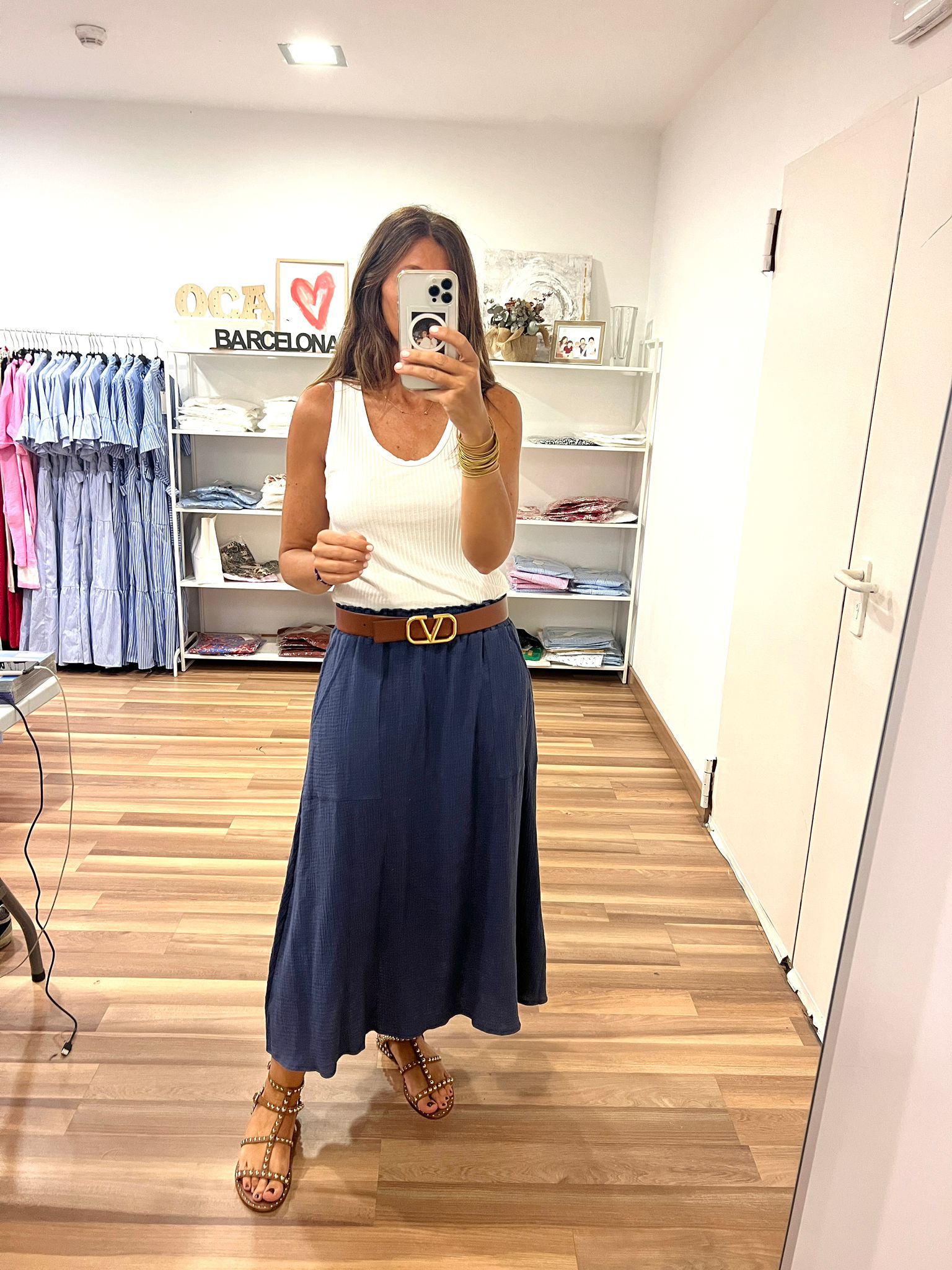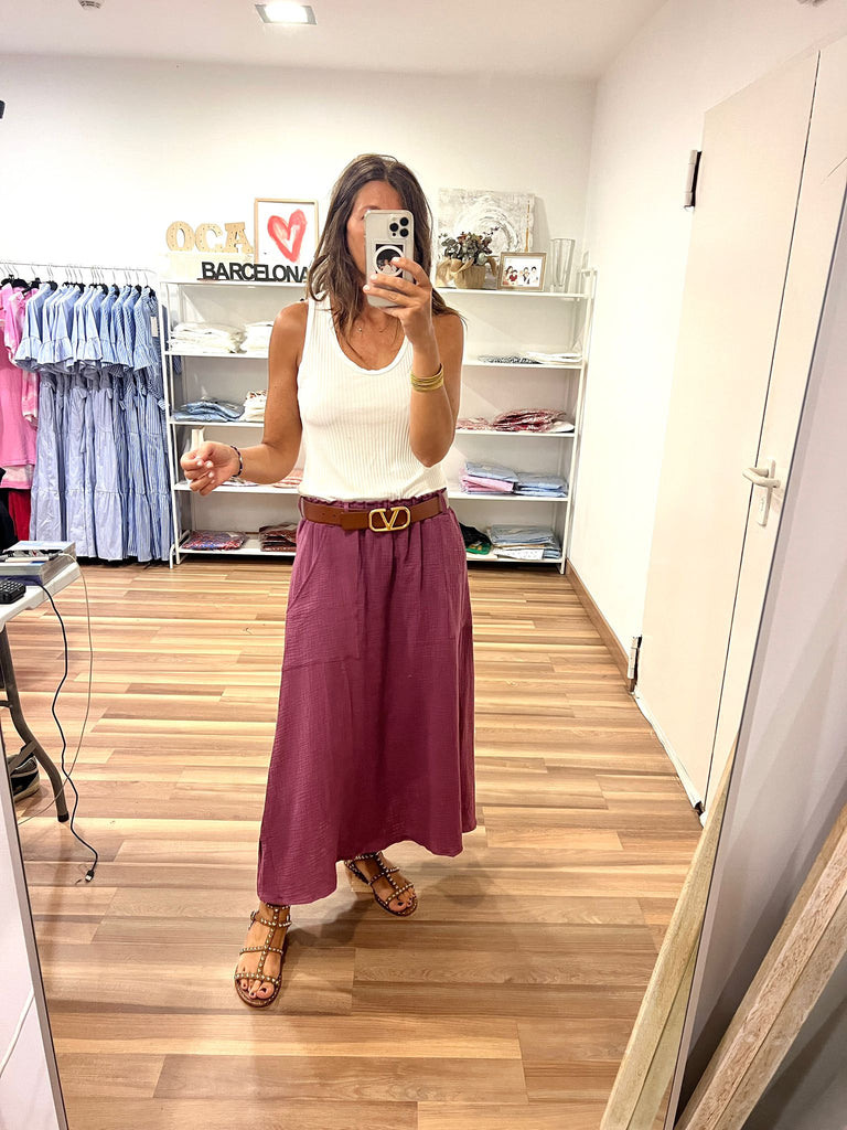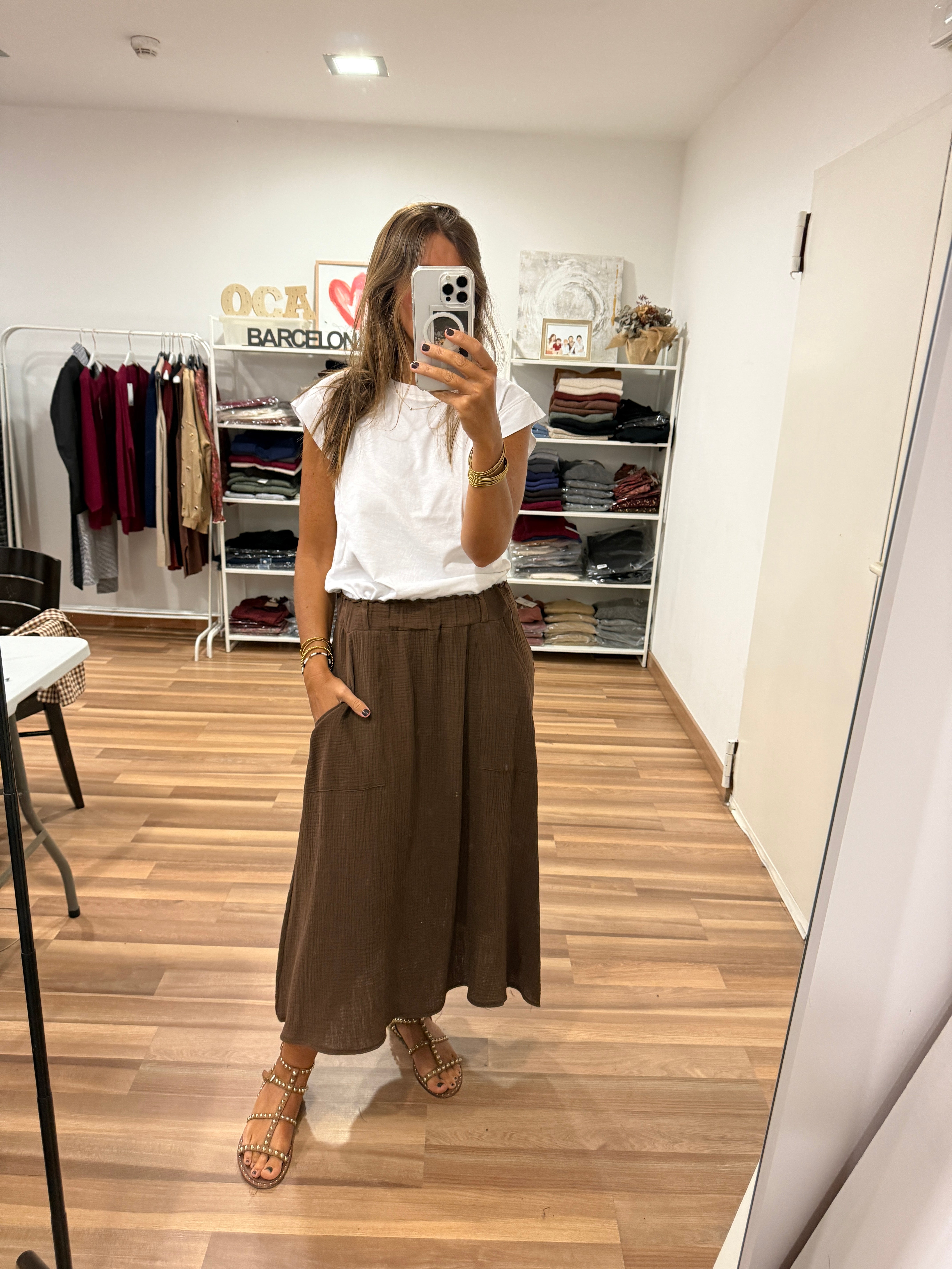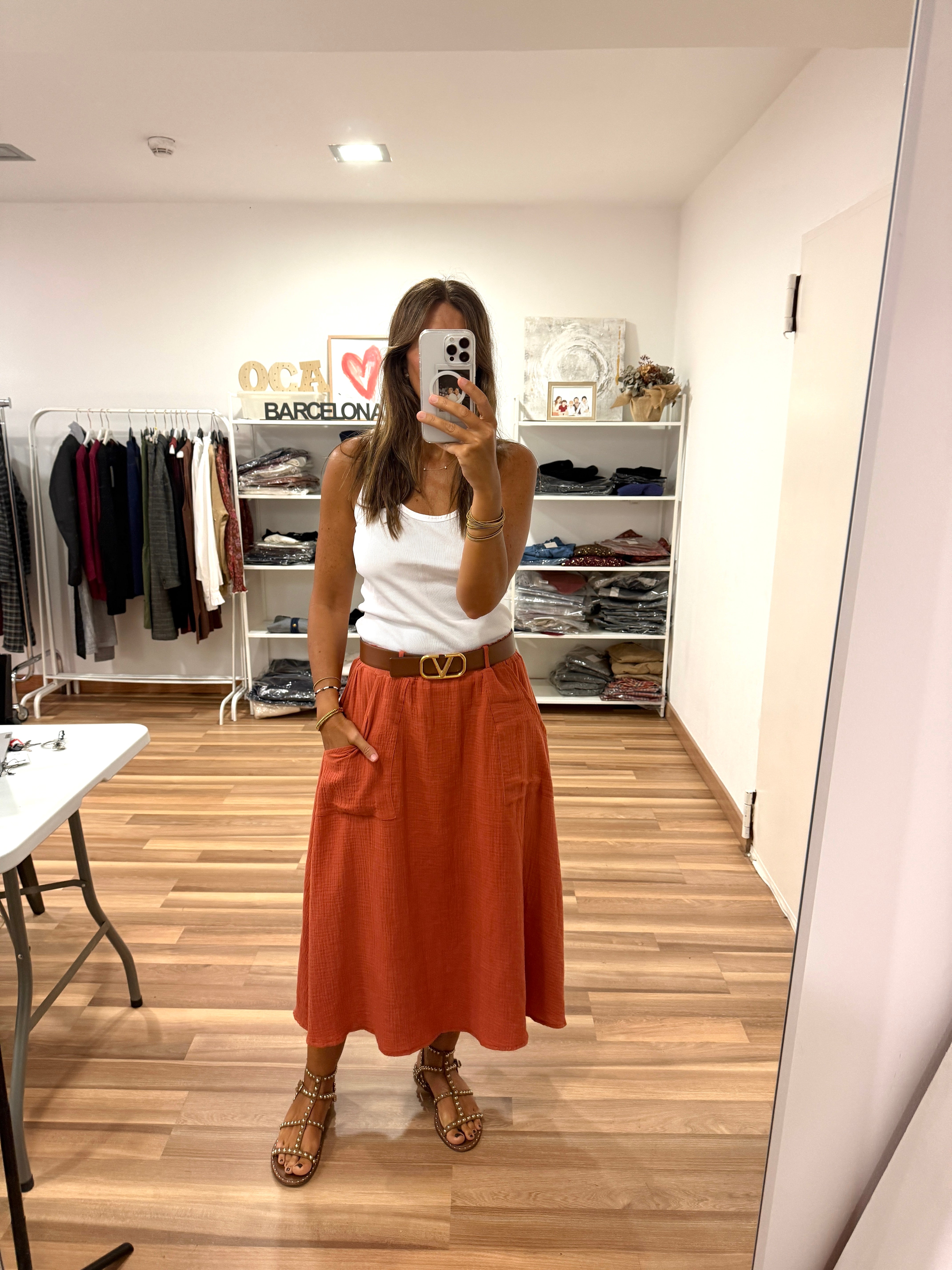 Falda muselina ideal , midi, con bolsillos laterales y trabillas para cinturón. Talla única