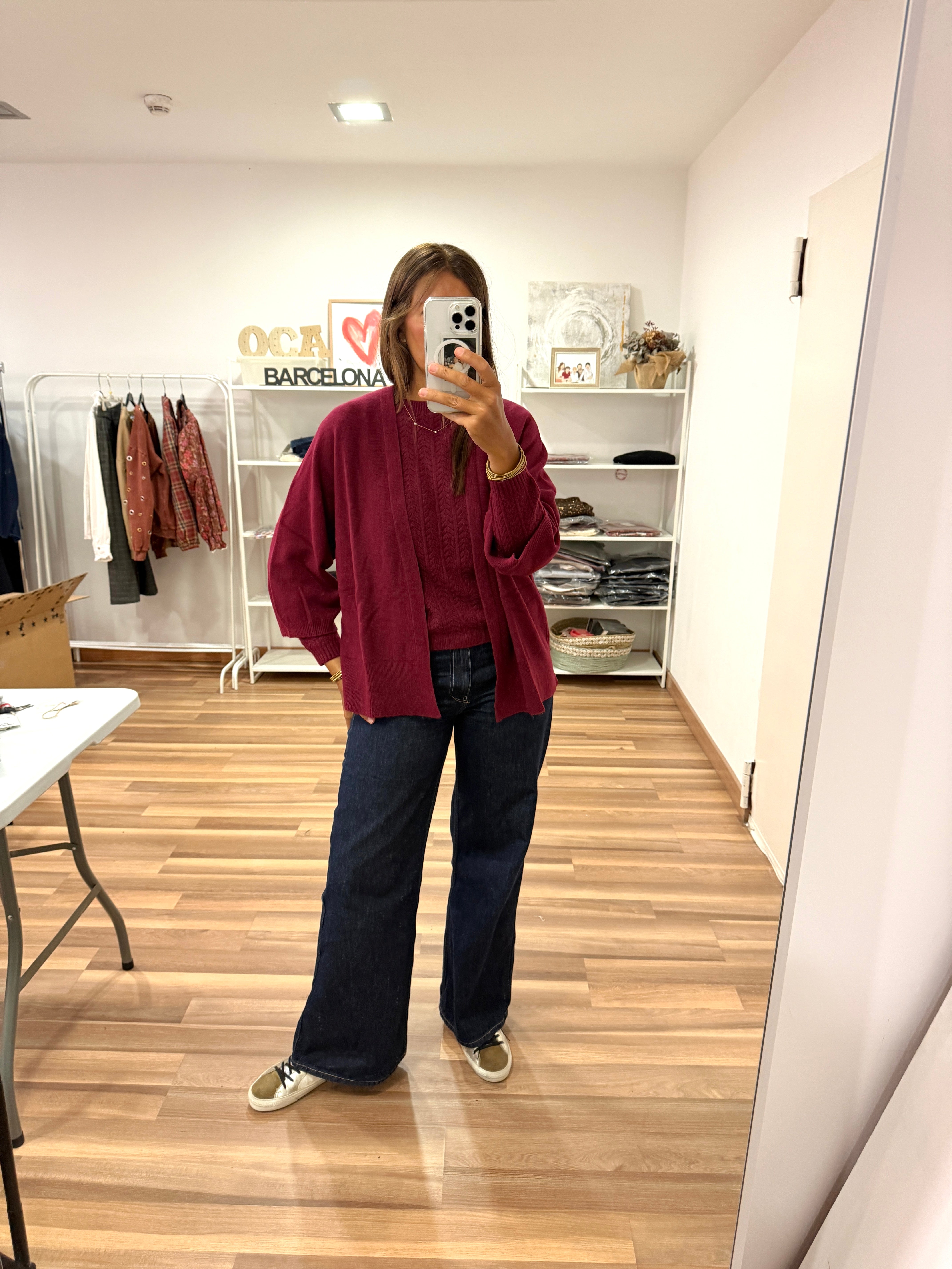 Chaquetita granate, tipo cárdigan, manga anchita tres cuartos, para llevar abierto. Talla única