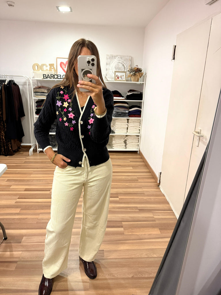Chaquetita negra, escote en V, manga larga, abotonada, con detalle de borde de escote y cierra en blanco y flores bordadas en delantero. Talla única.