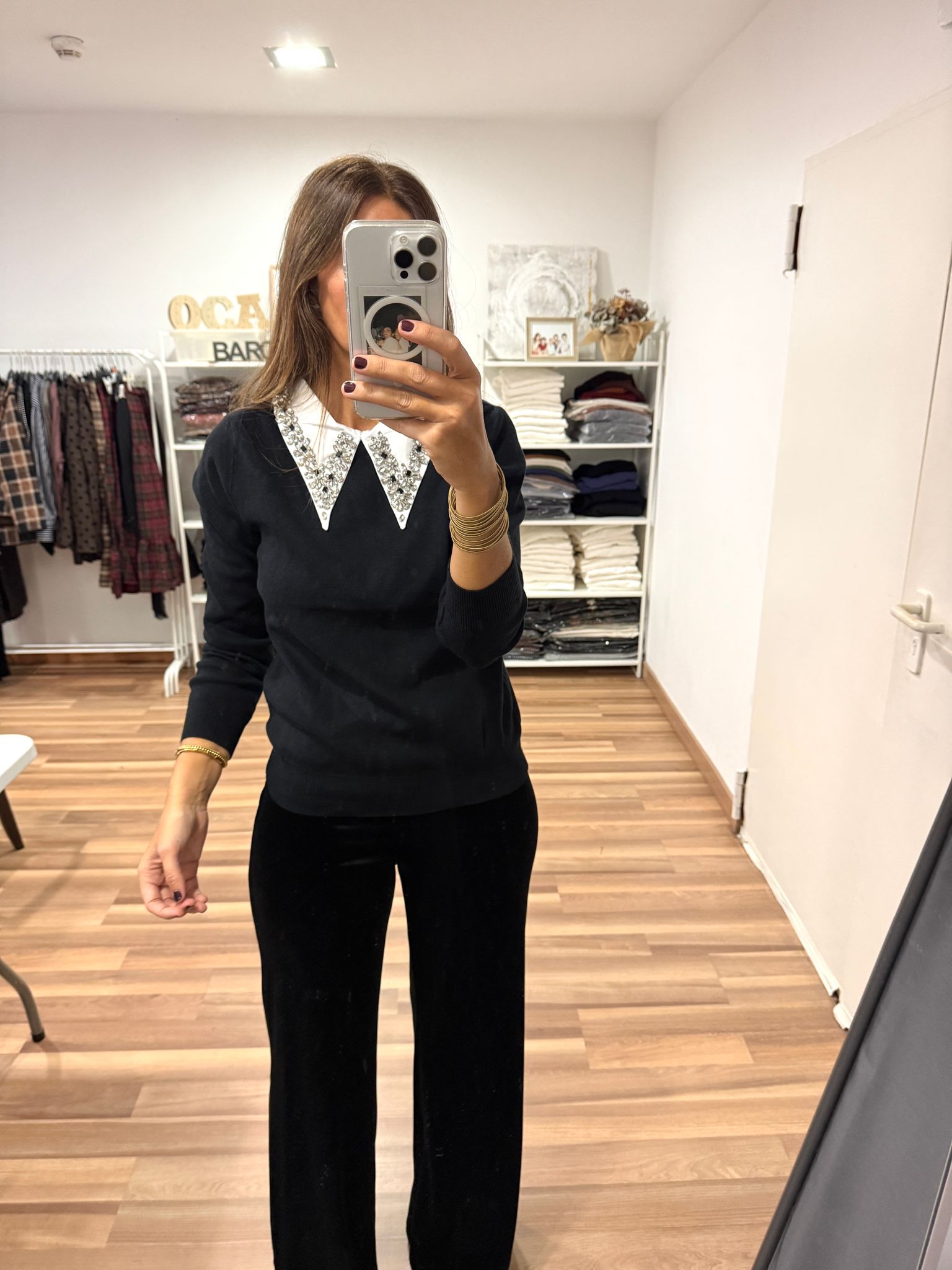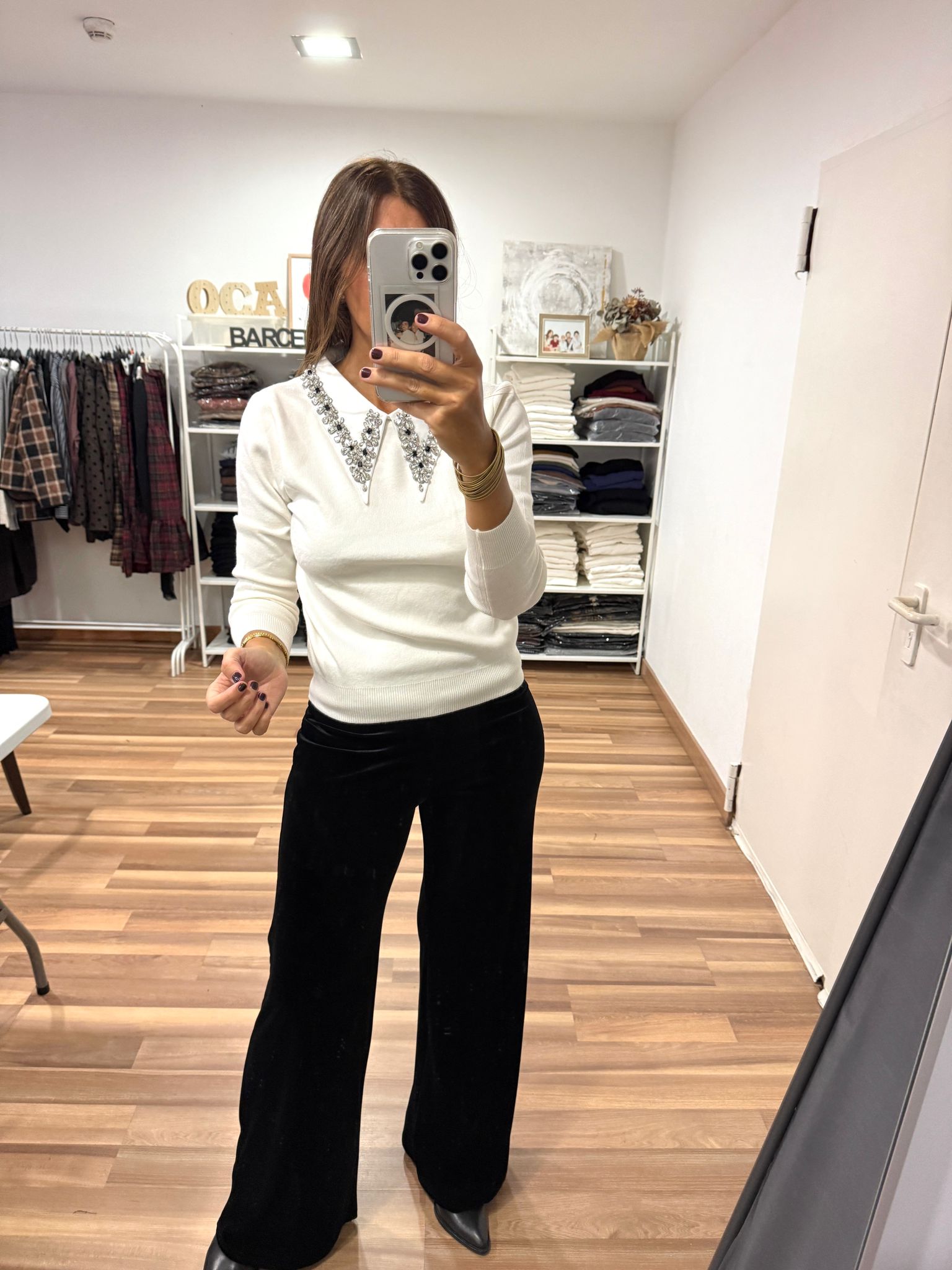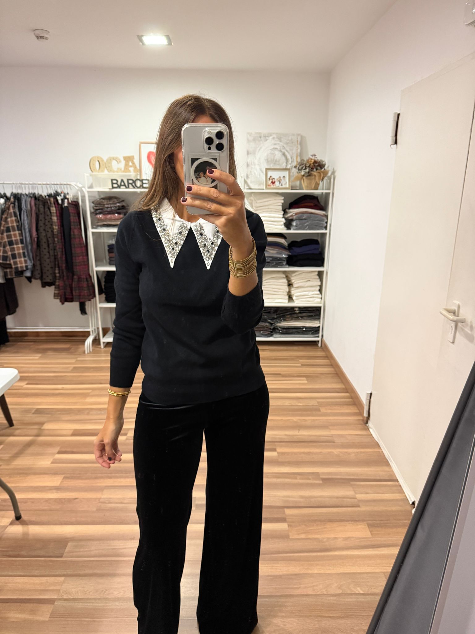 Jersey de manga larga con detalle de cuello camisero con pedrería.