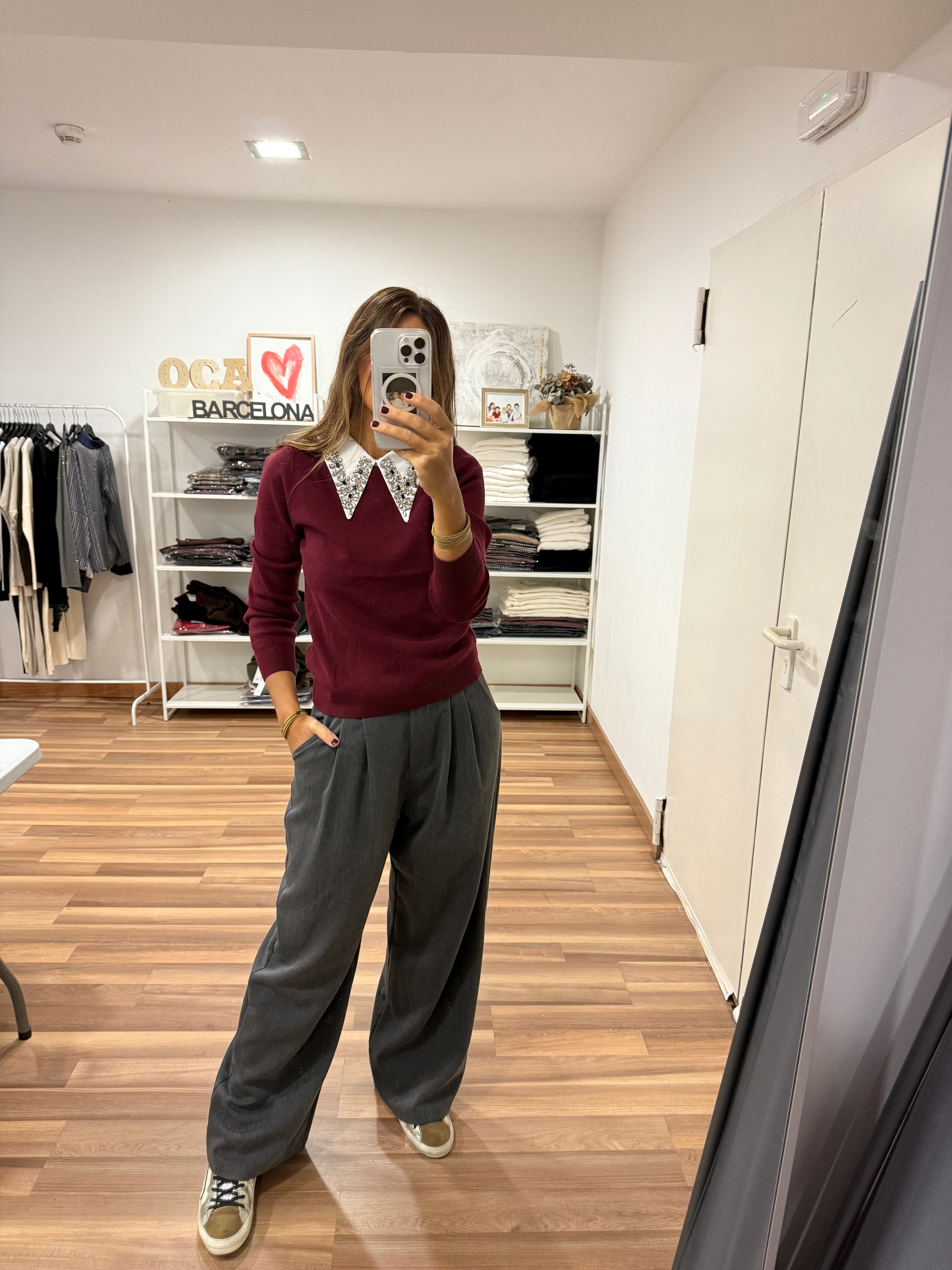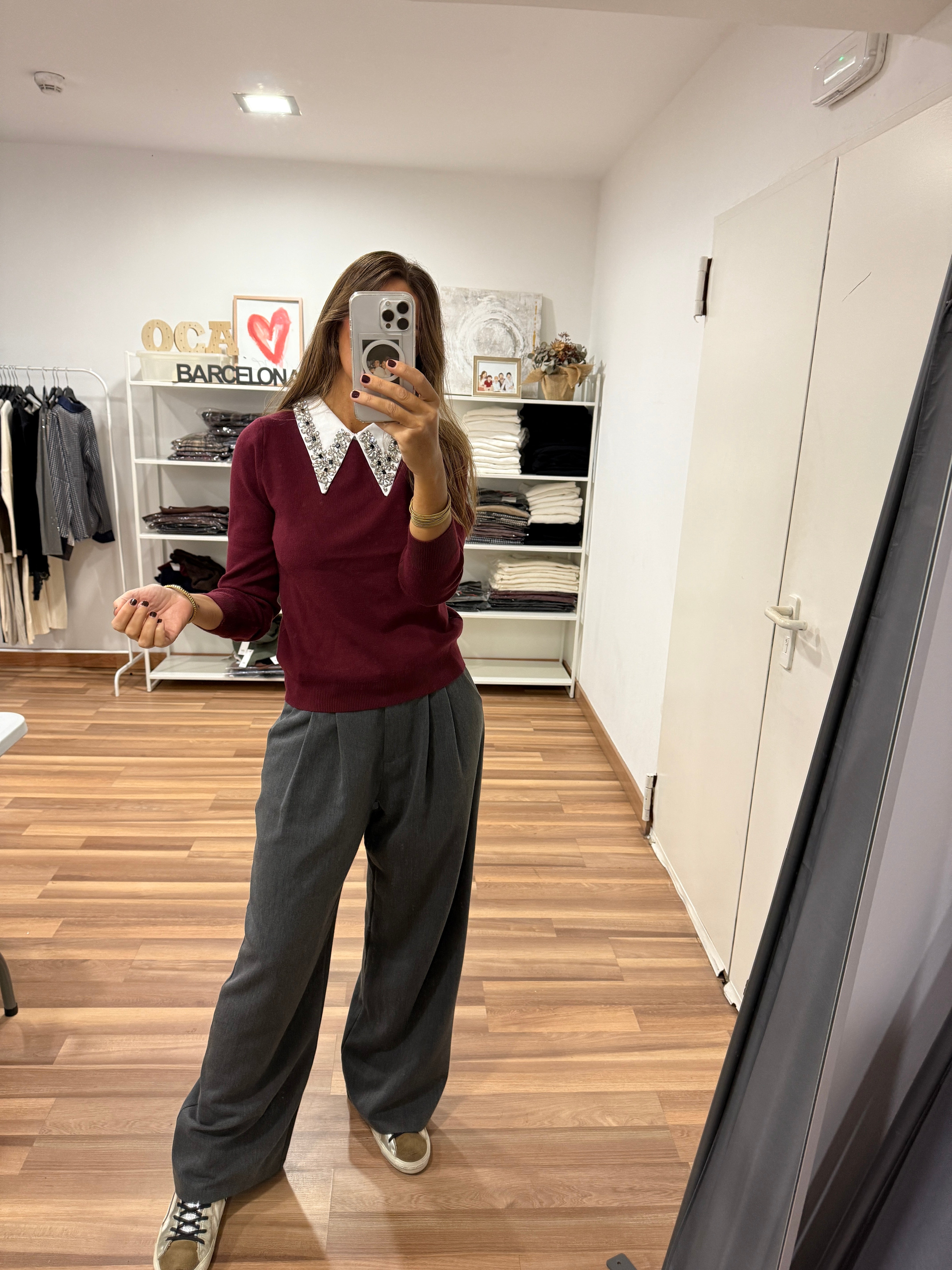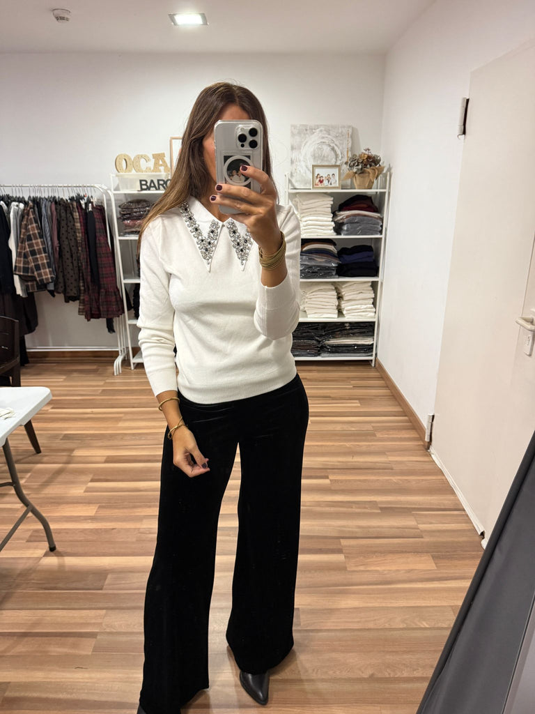 Jersey de manga larga con detalle de cuello camisero con pedrería.