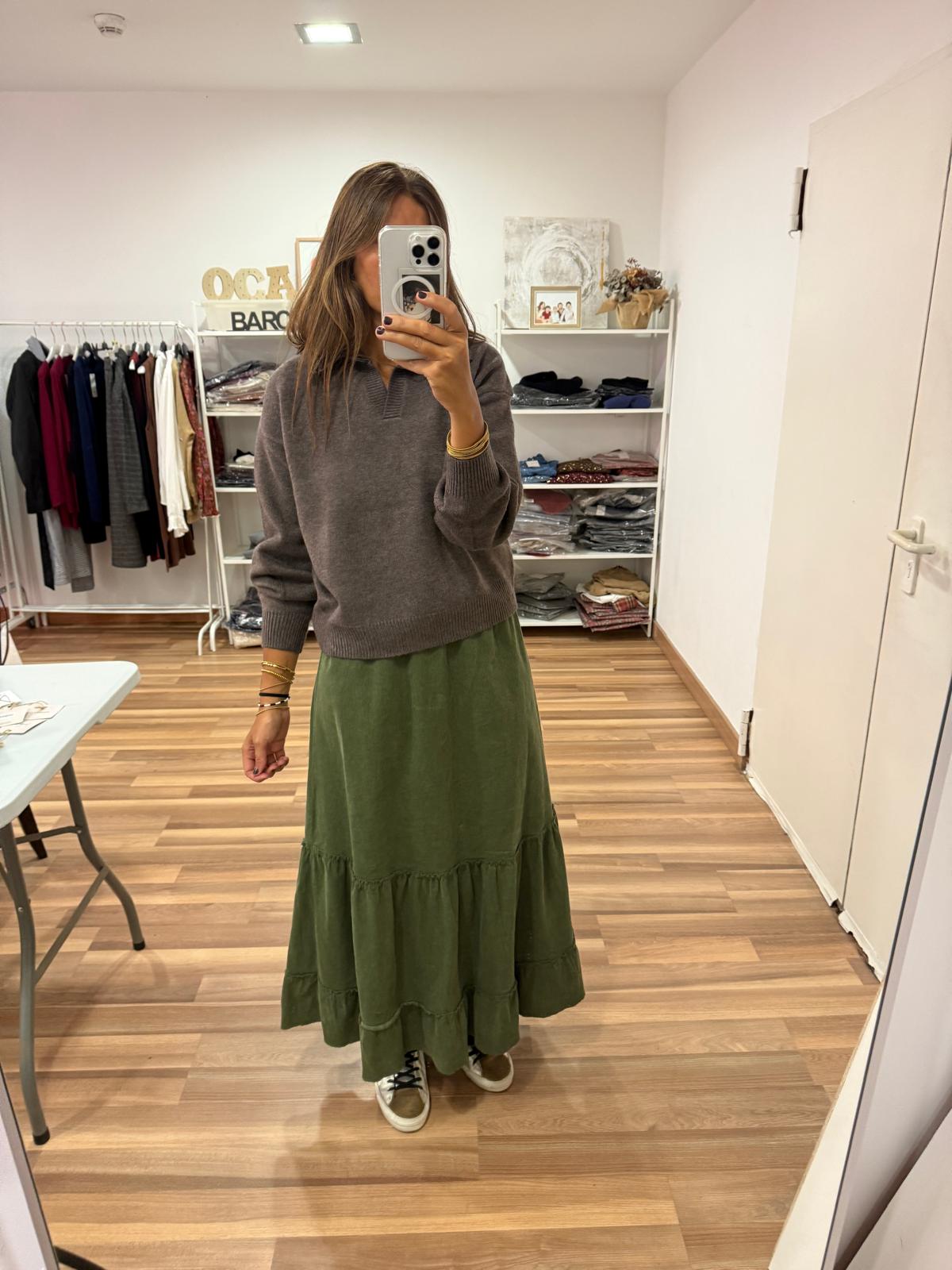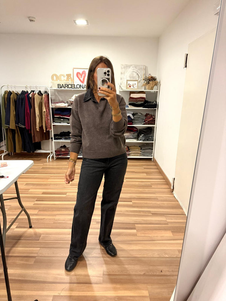 Jersey gustoso gris, manga larga con detalle de cuello tipo camisero en denim negro. Talla única