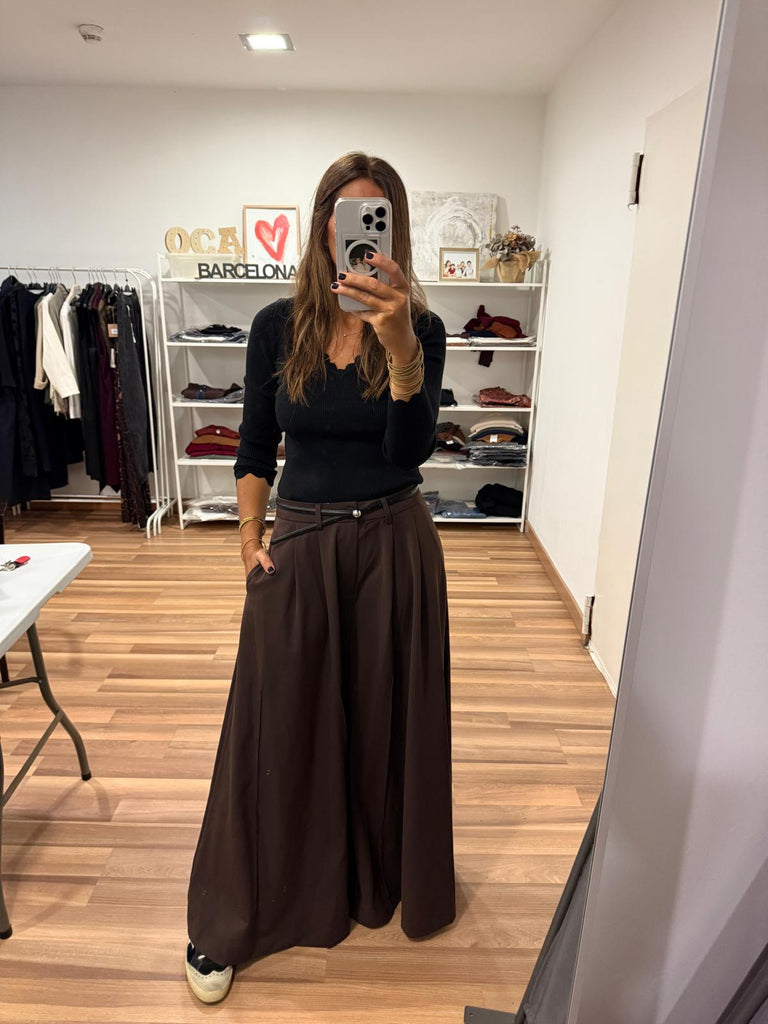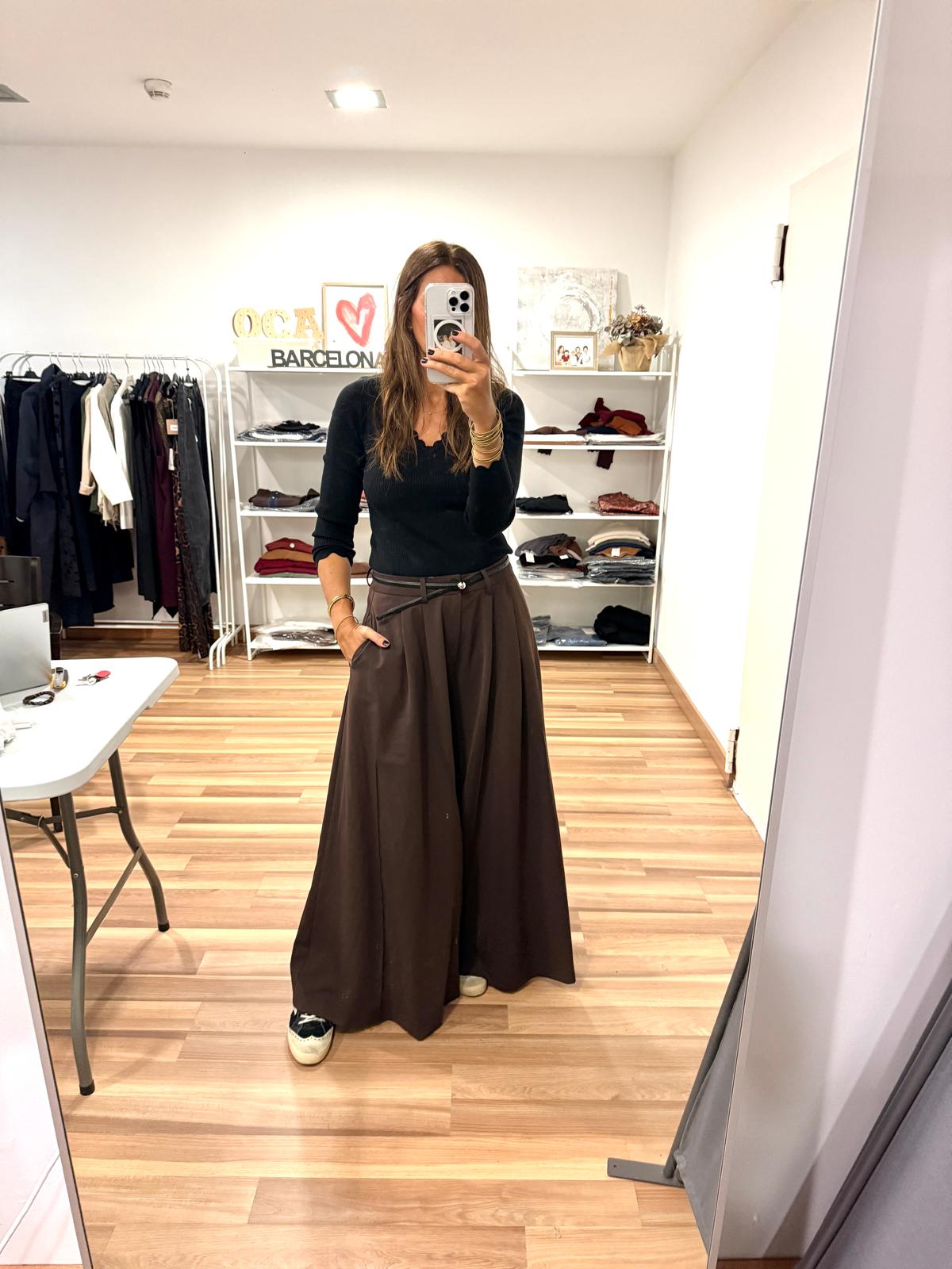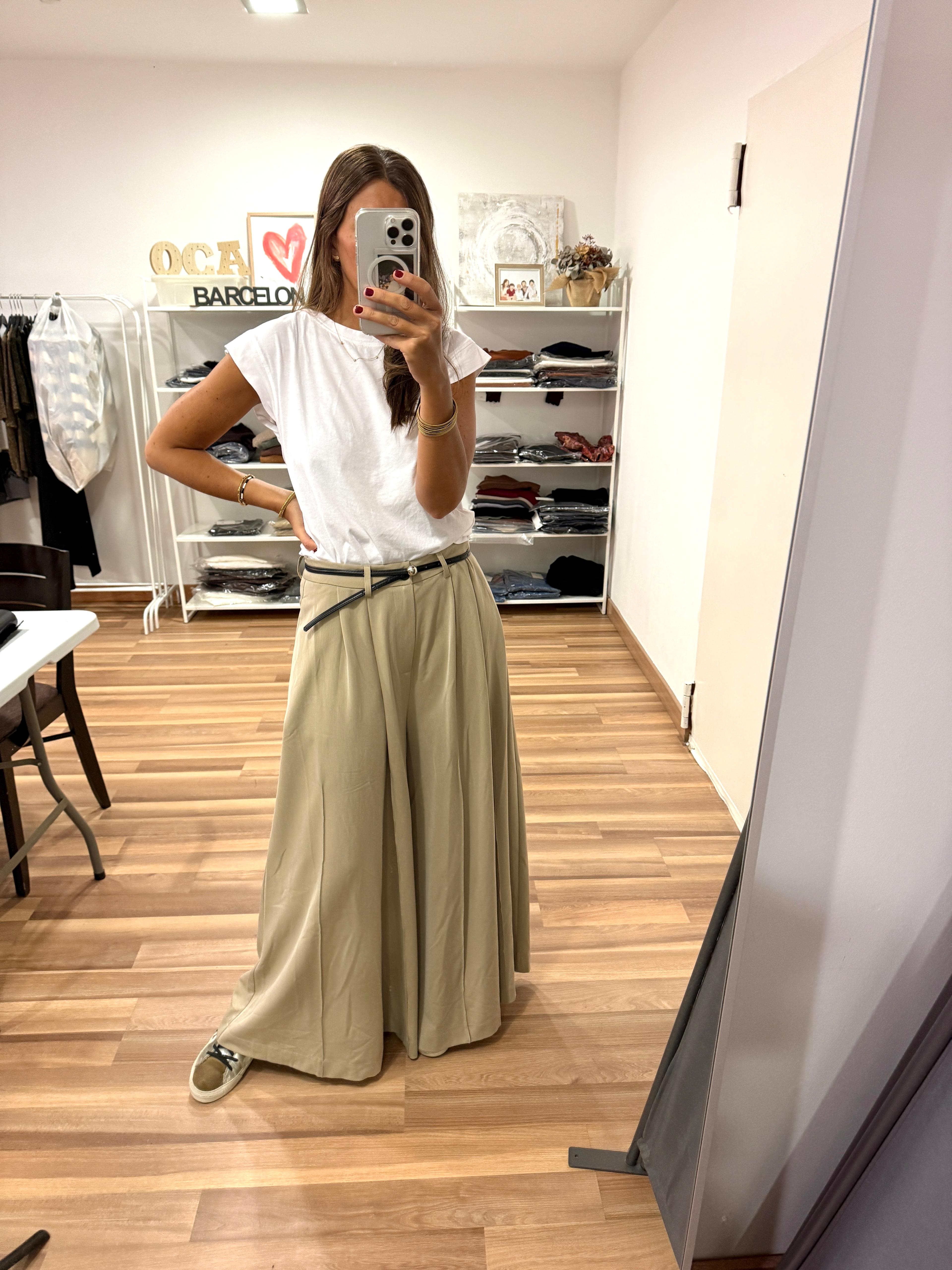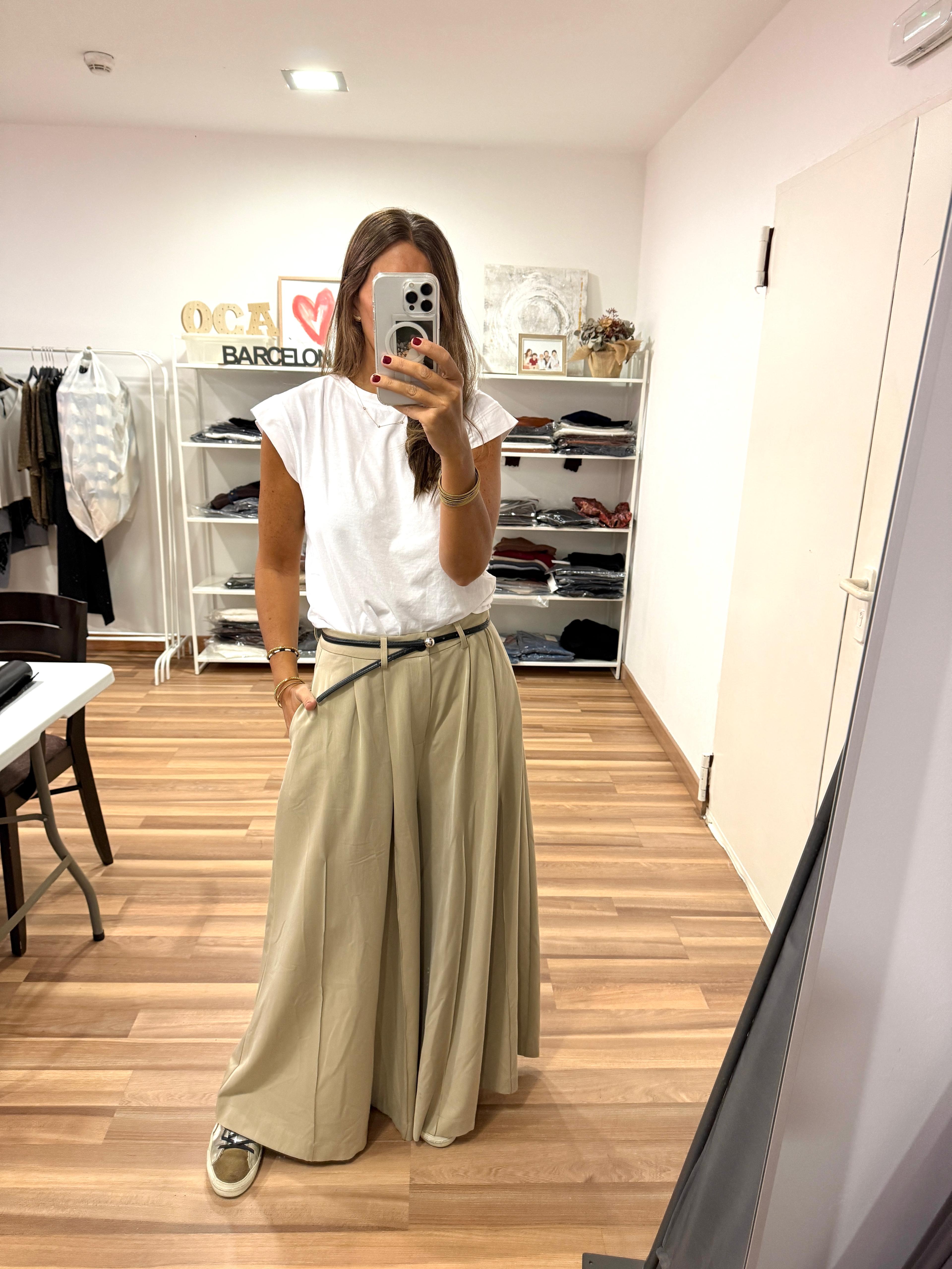 Pantalón ancho, con pinzas delanteras, bolsillos laterales y cinturón (se puede sacar).