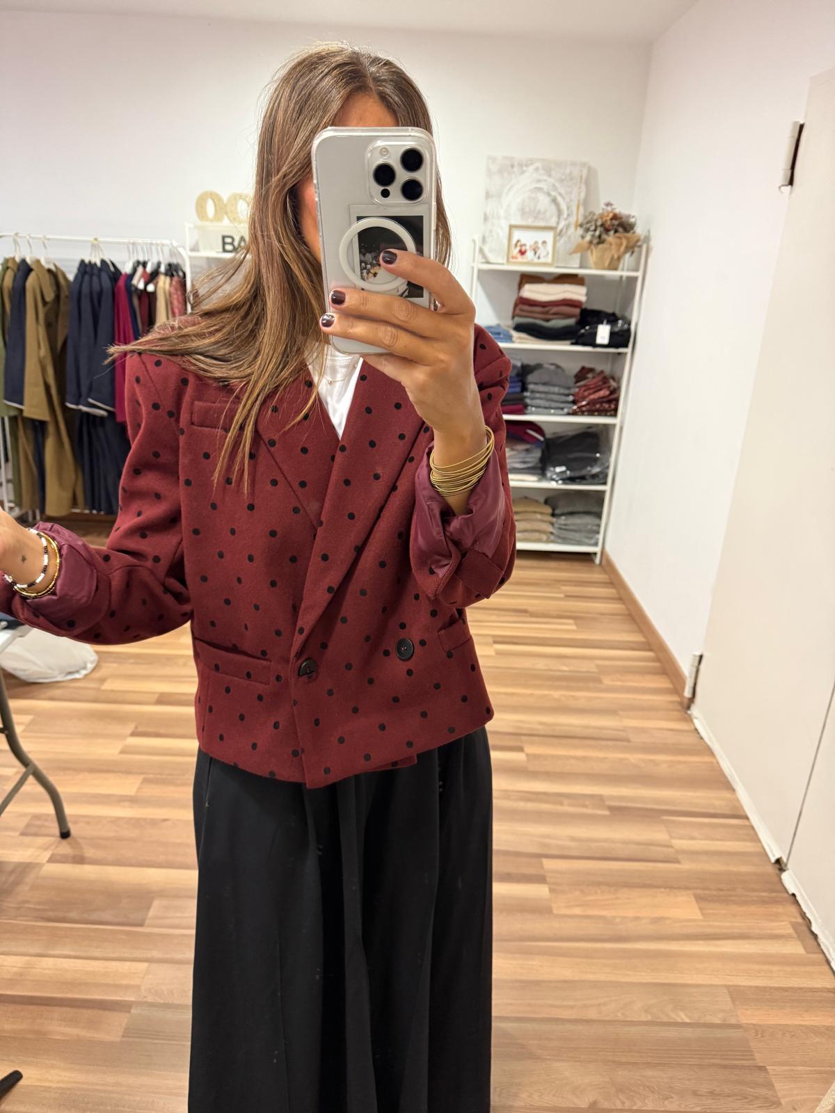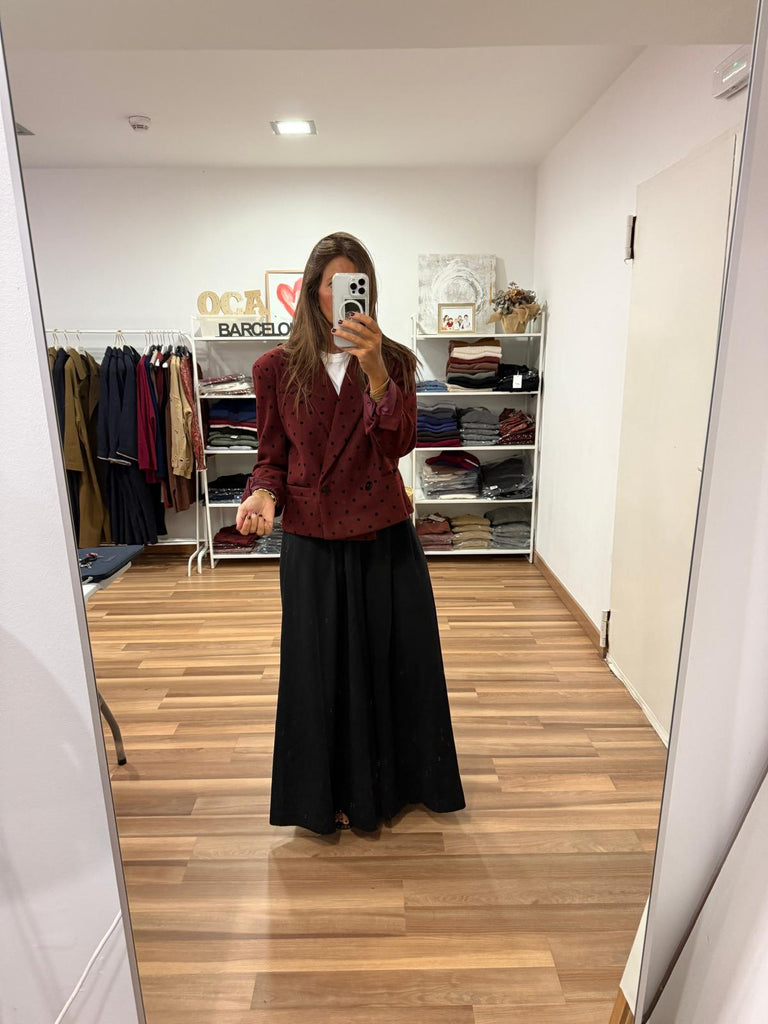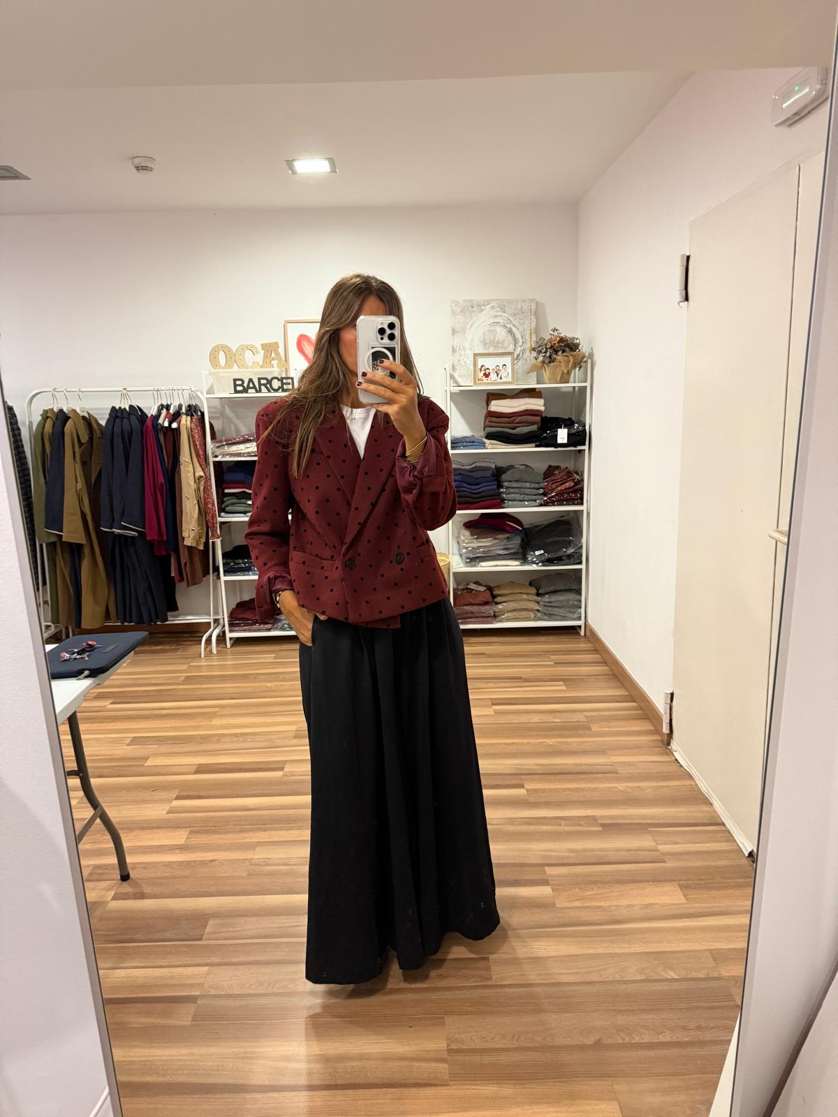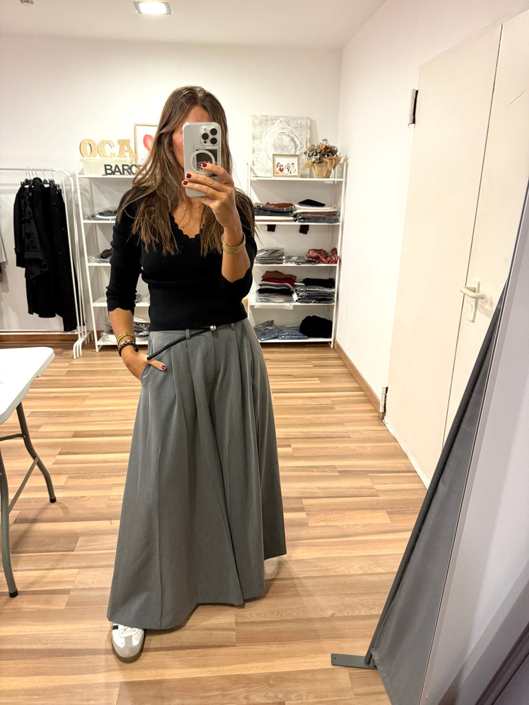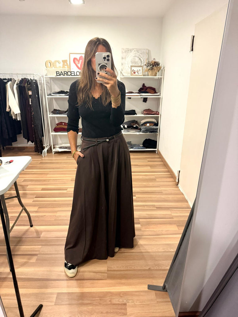 Pantalón ancho, con pinzas delanteras, bolsillos laterales y cinturón (se puede sacar).