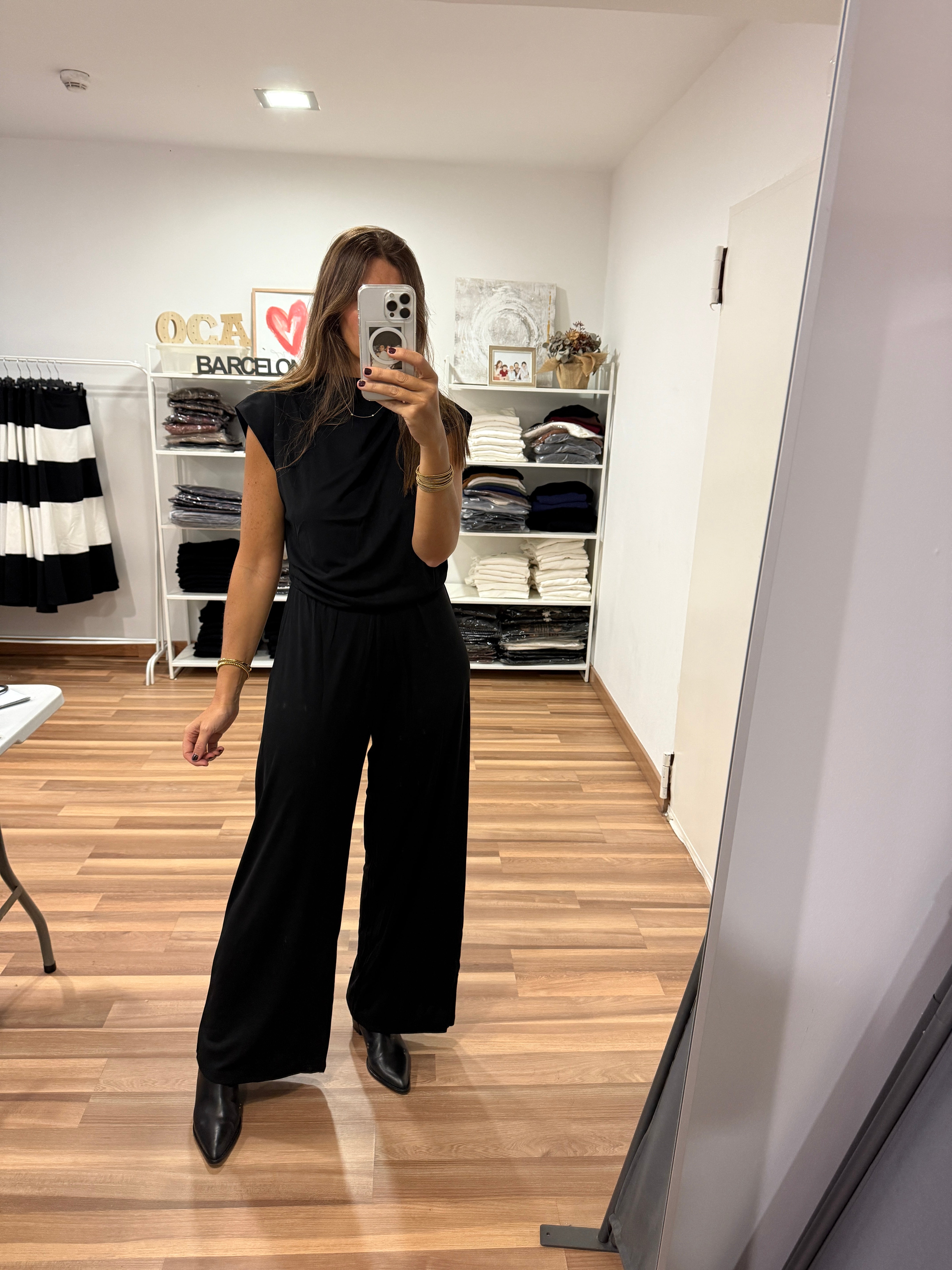 Mono negro fluido sin mangas (detalle manguita caída). Fruncidito en el hombro.