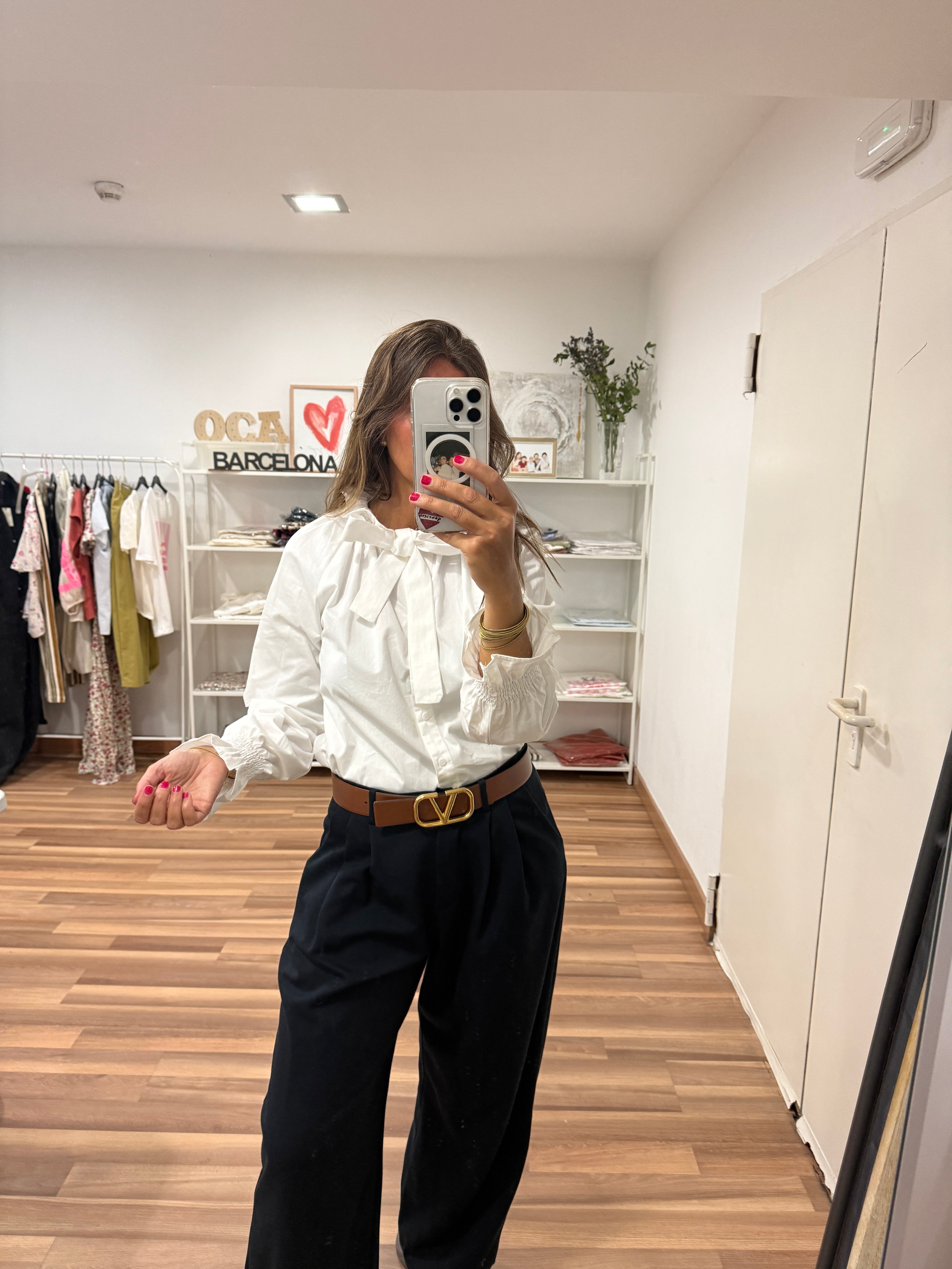 Blusita abotonada con detalle de volante en el cuello y lazo. Mangas con goma en muñeca.