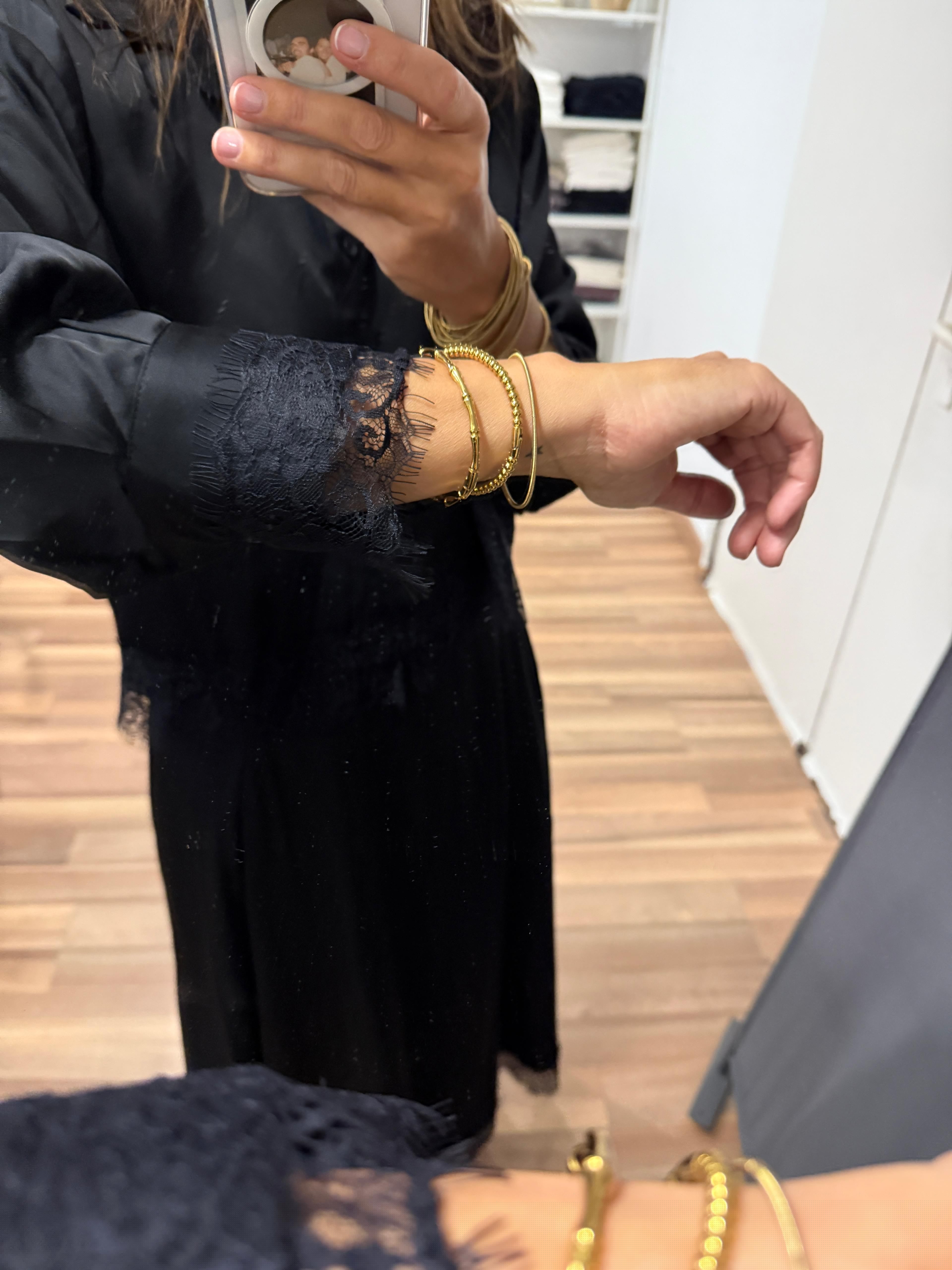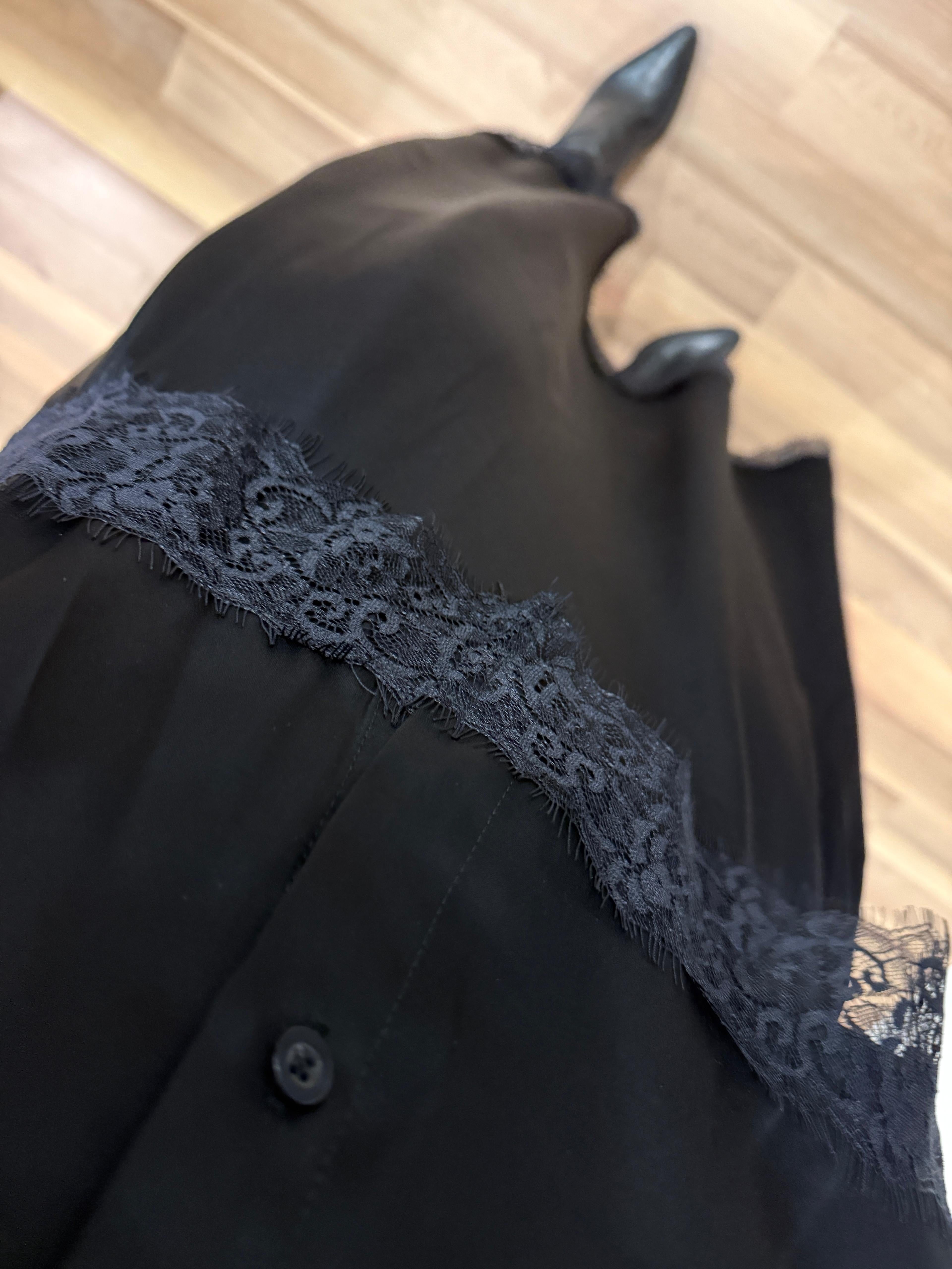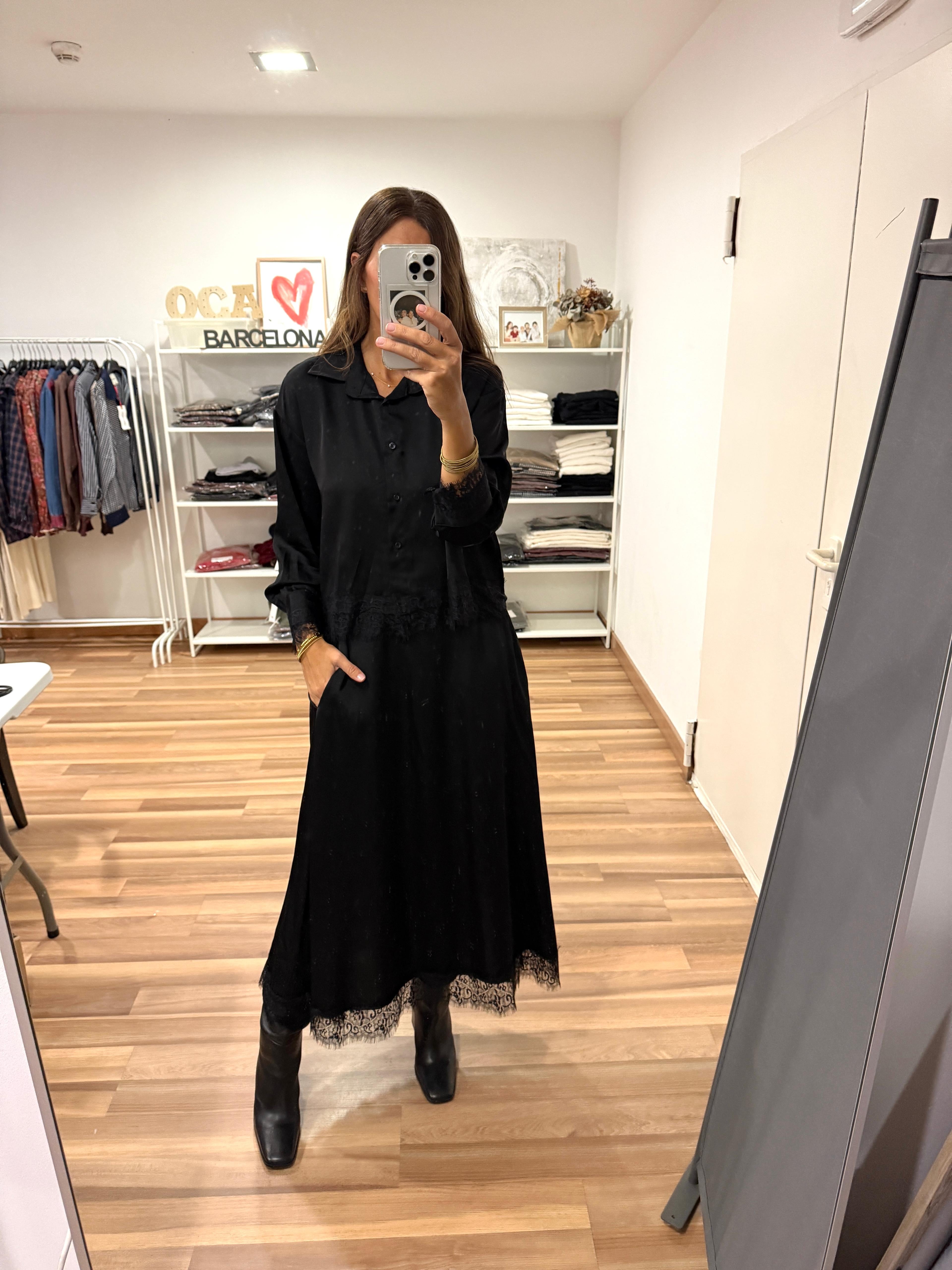 Camisa negra satinada con encaje en mangas y abajo. Ideal para conjuntar con la falda satinada Fabiola. Talla única.