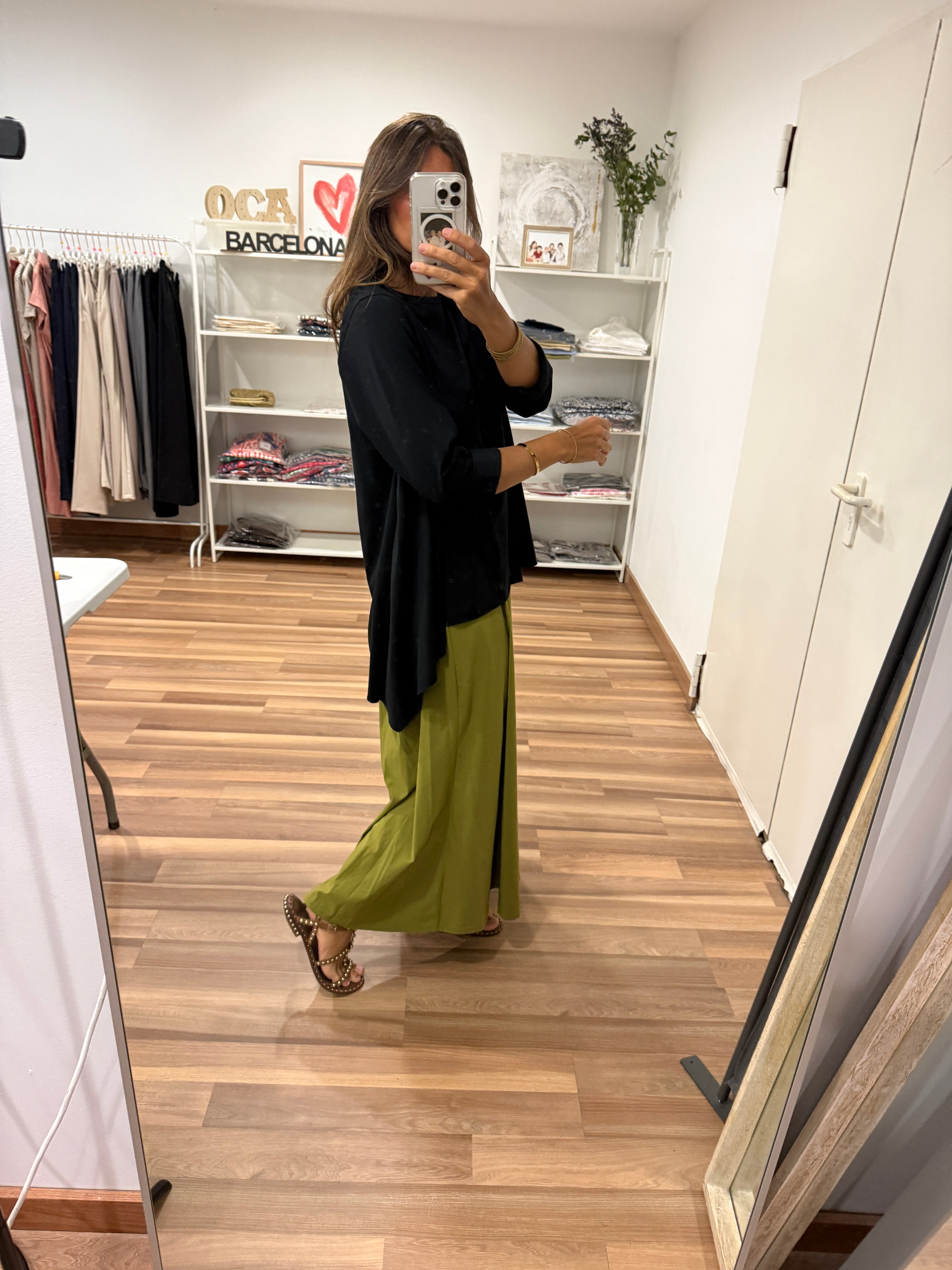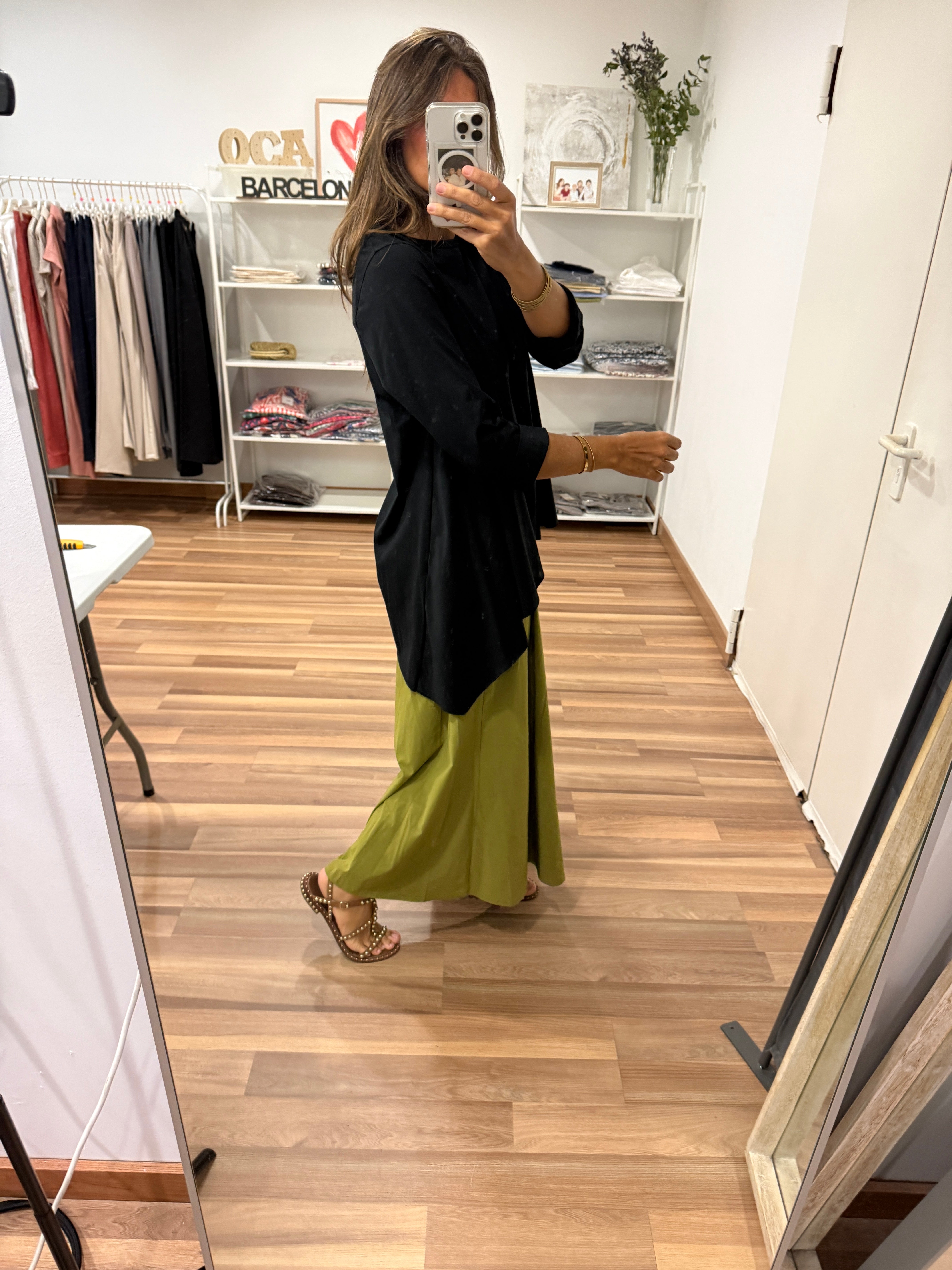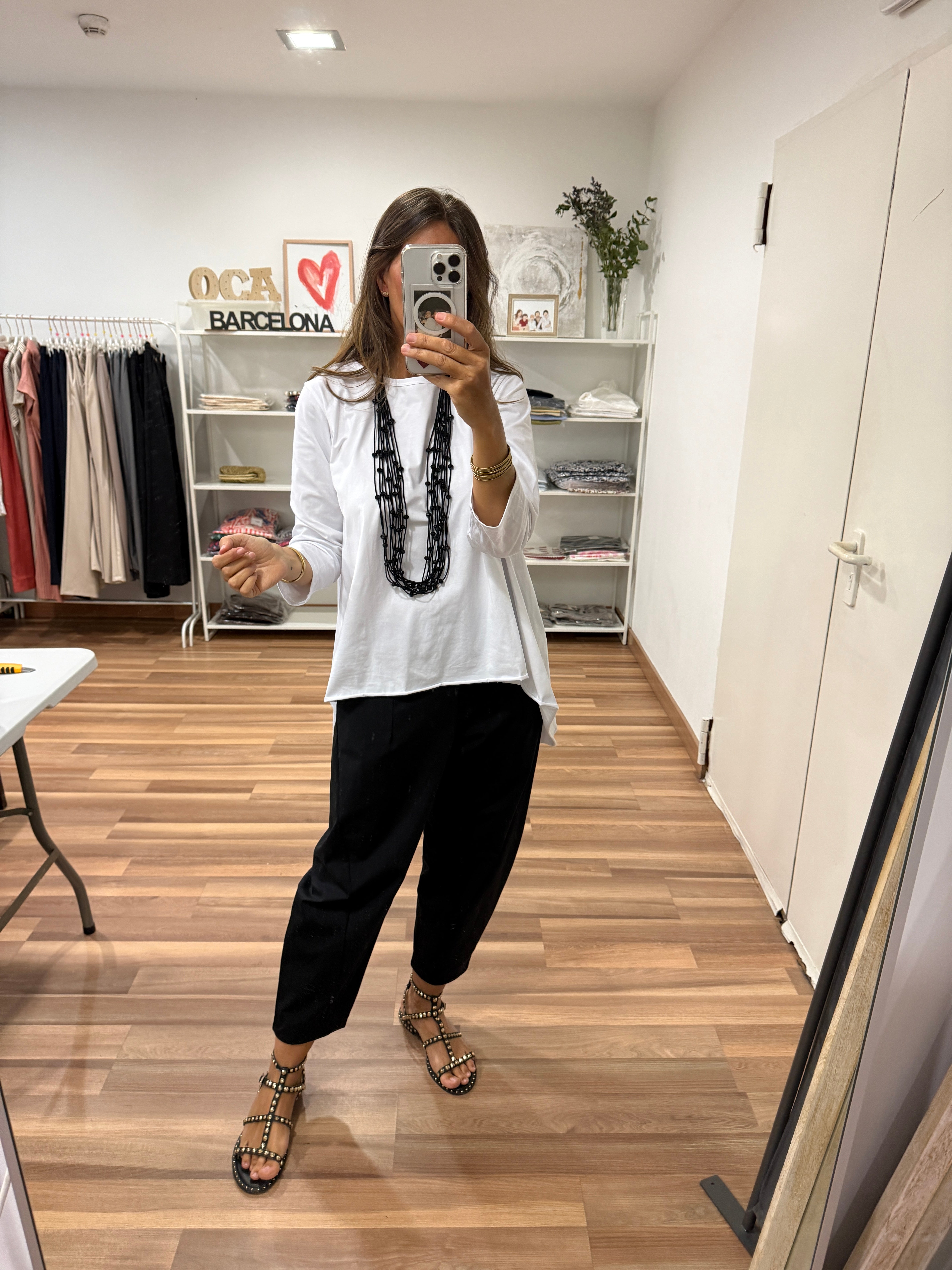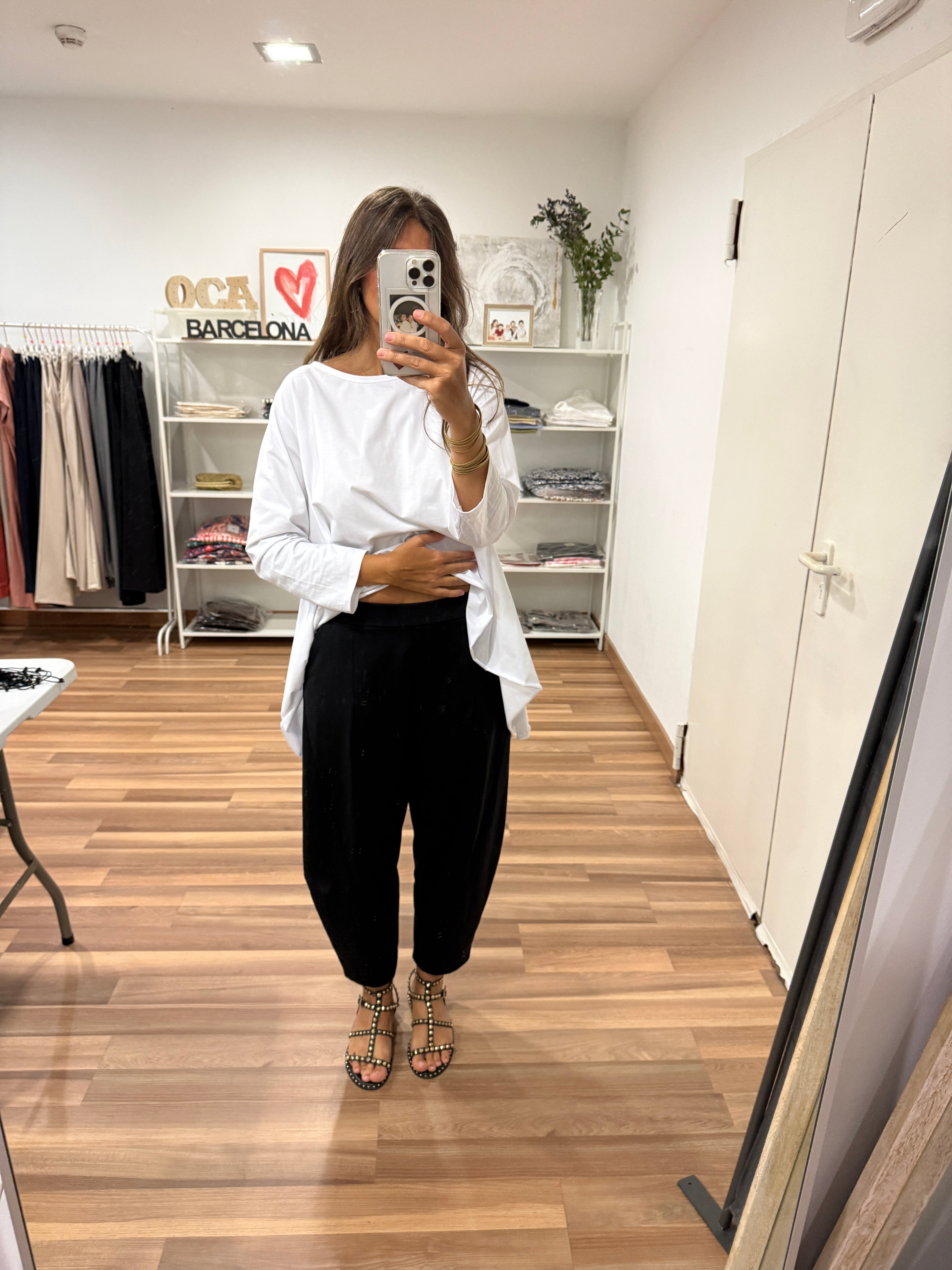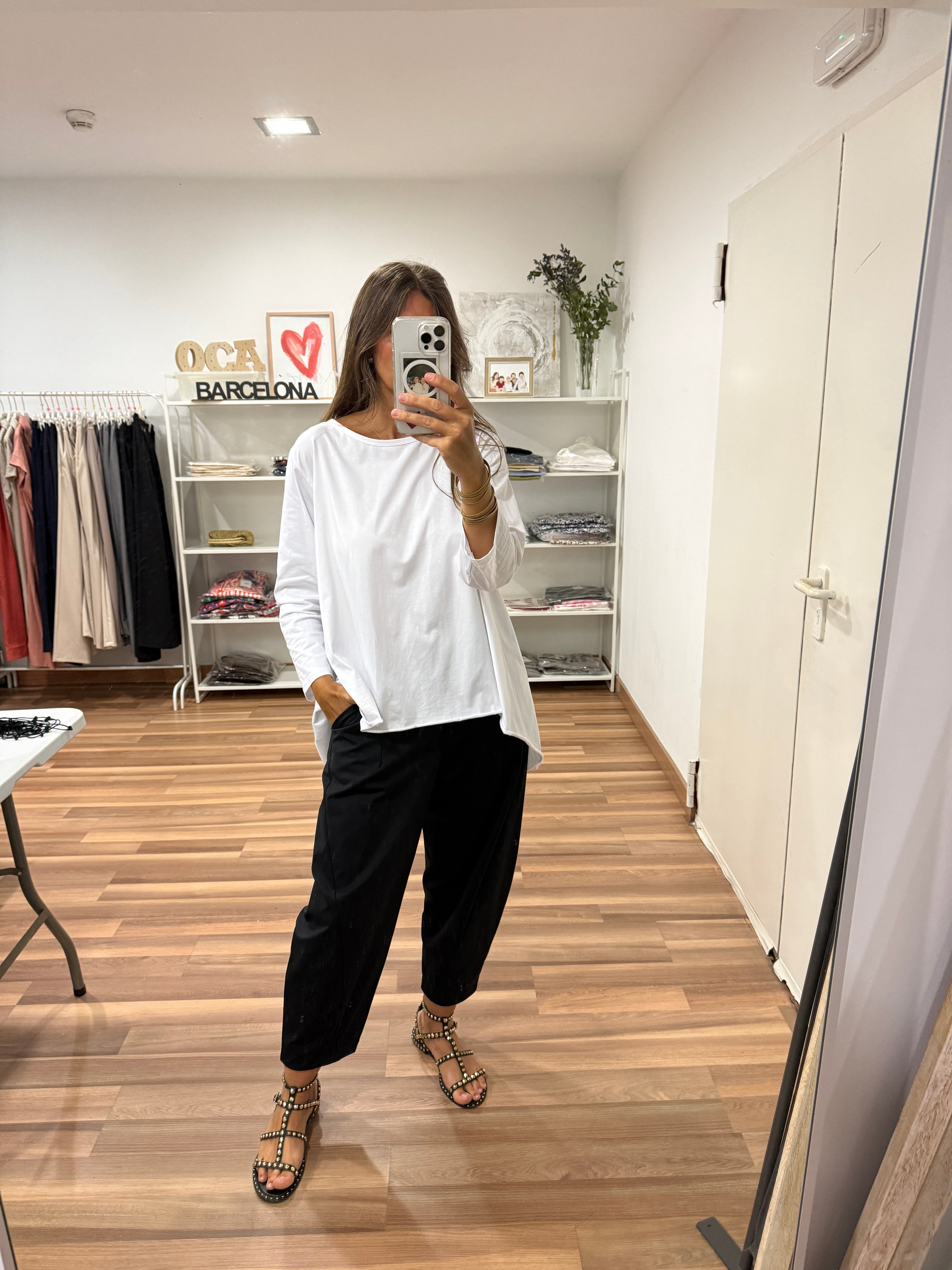 Camiseta con manga larga, ancha, cuello redondo y largos asimétricos. Talla única