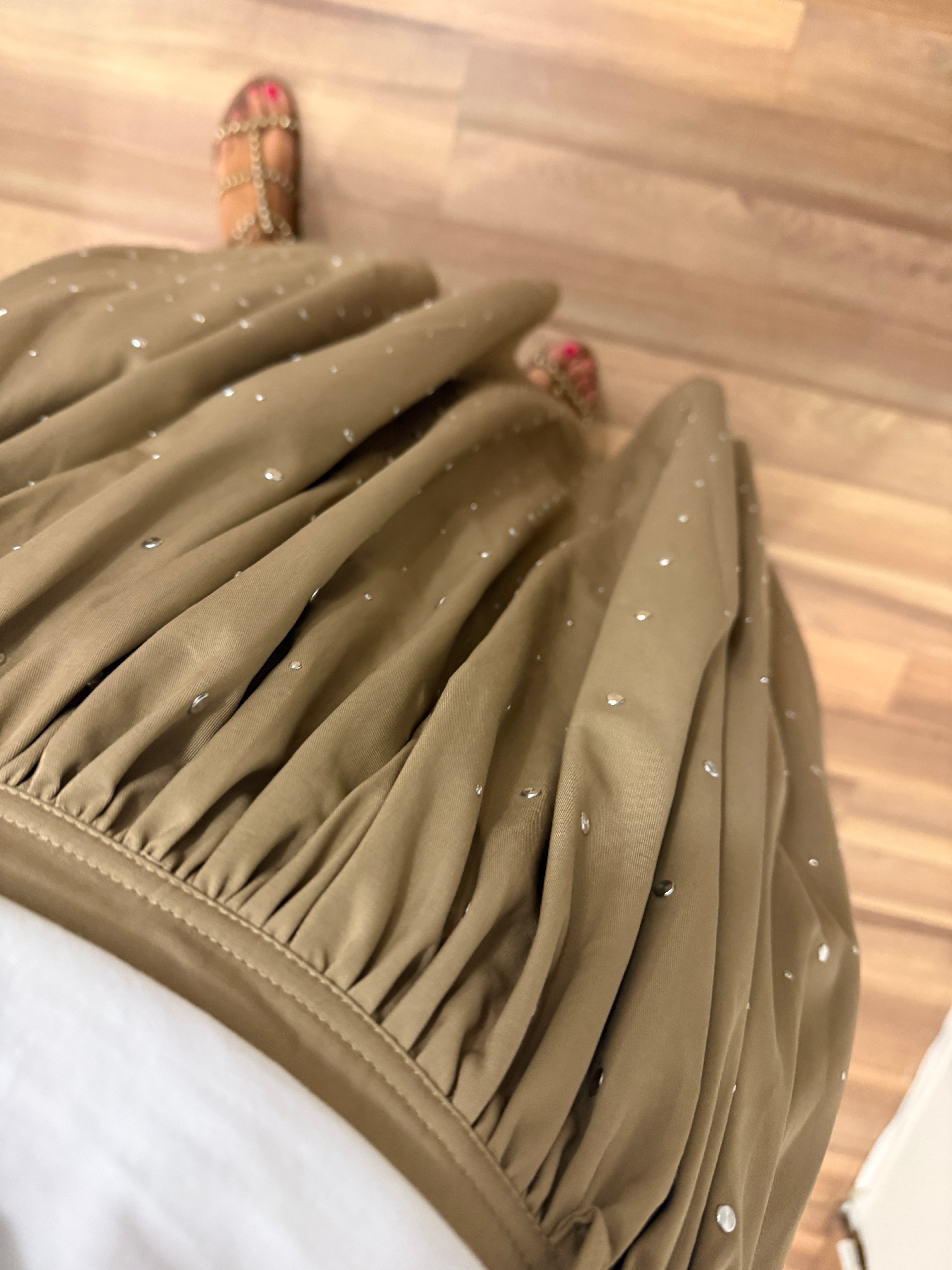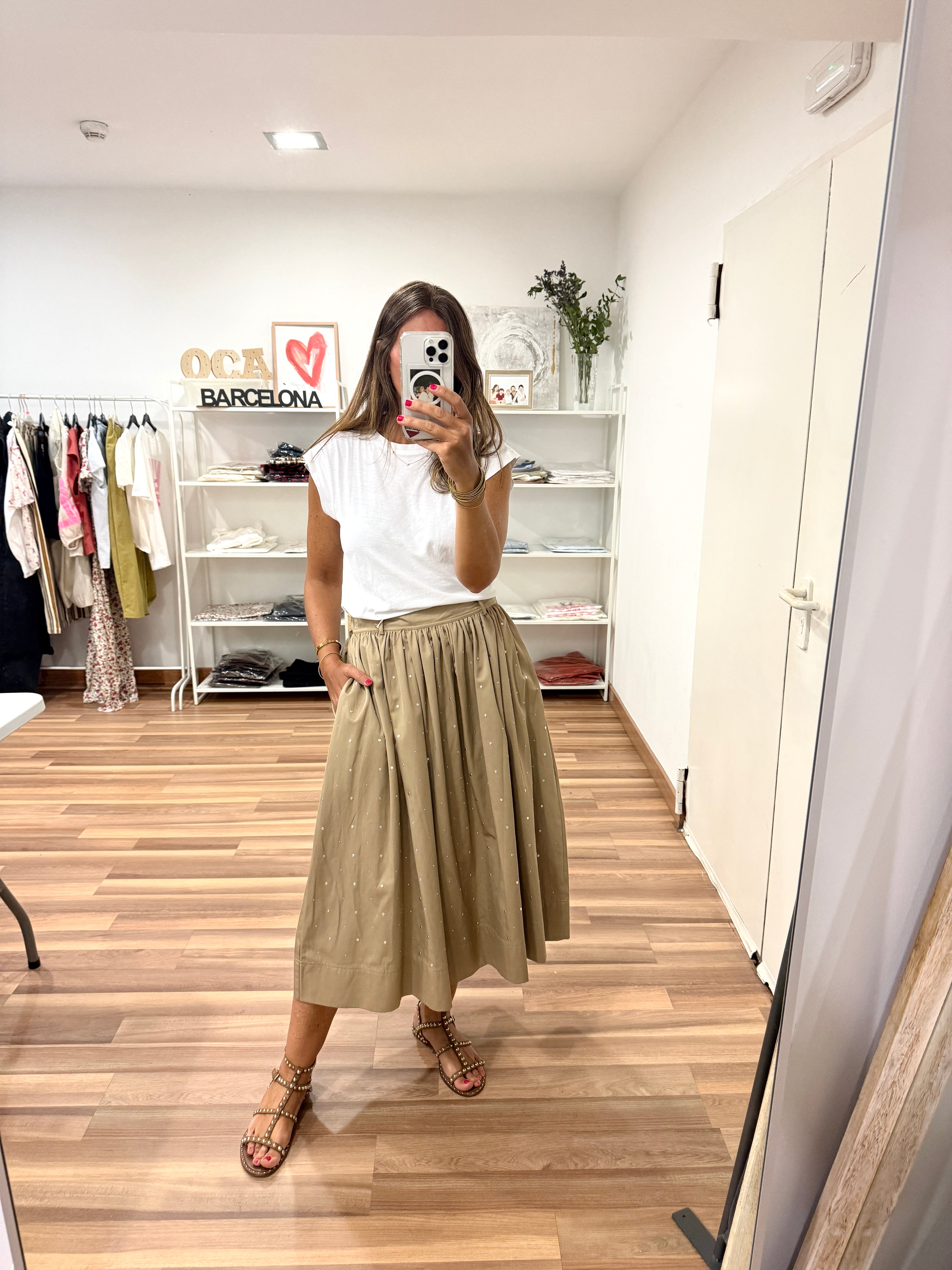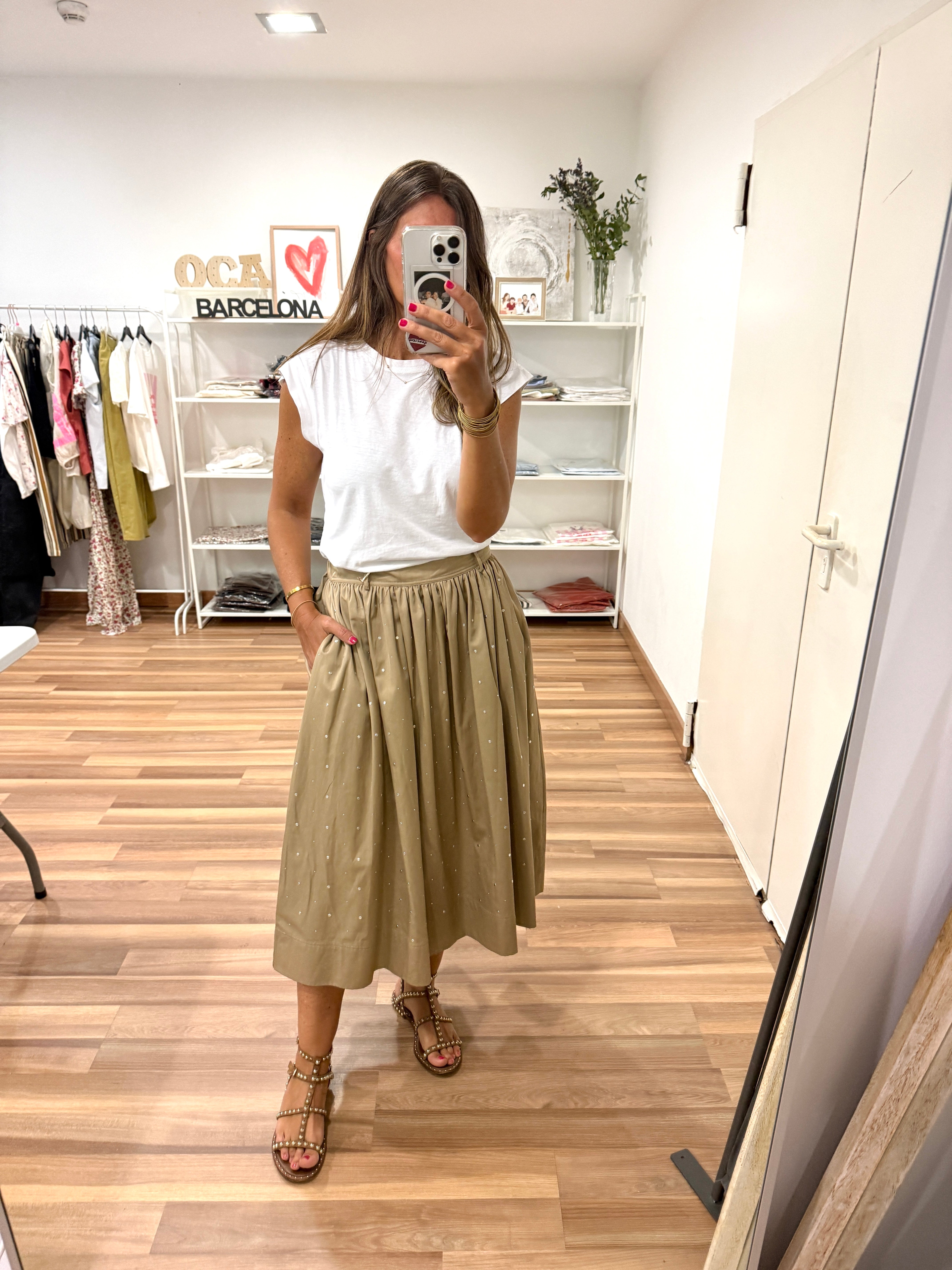 Falda del conjunto Adri con tachuelas plateadas pequeñas. Cintura elástica y con trabillas para cinturón. Bolsillos.