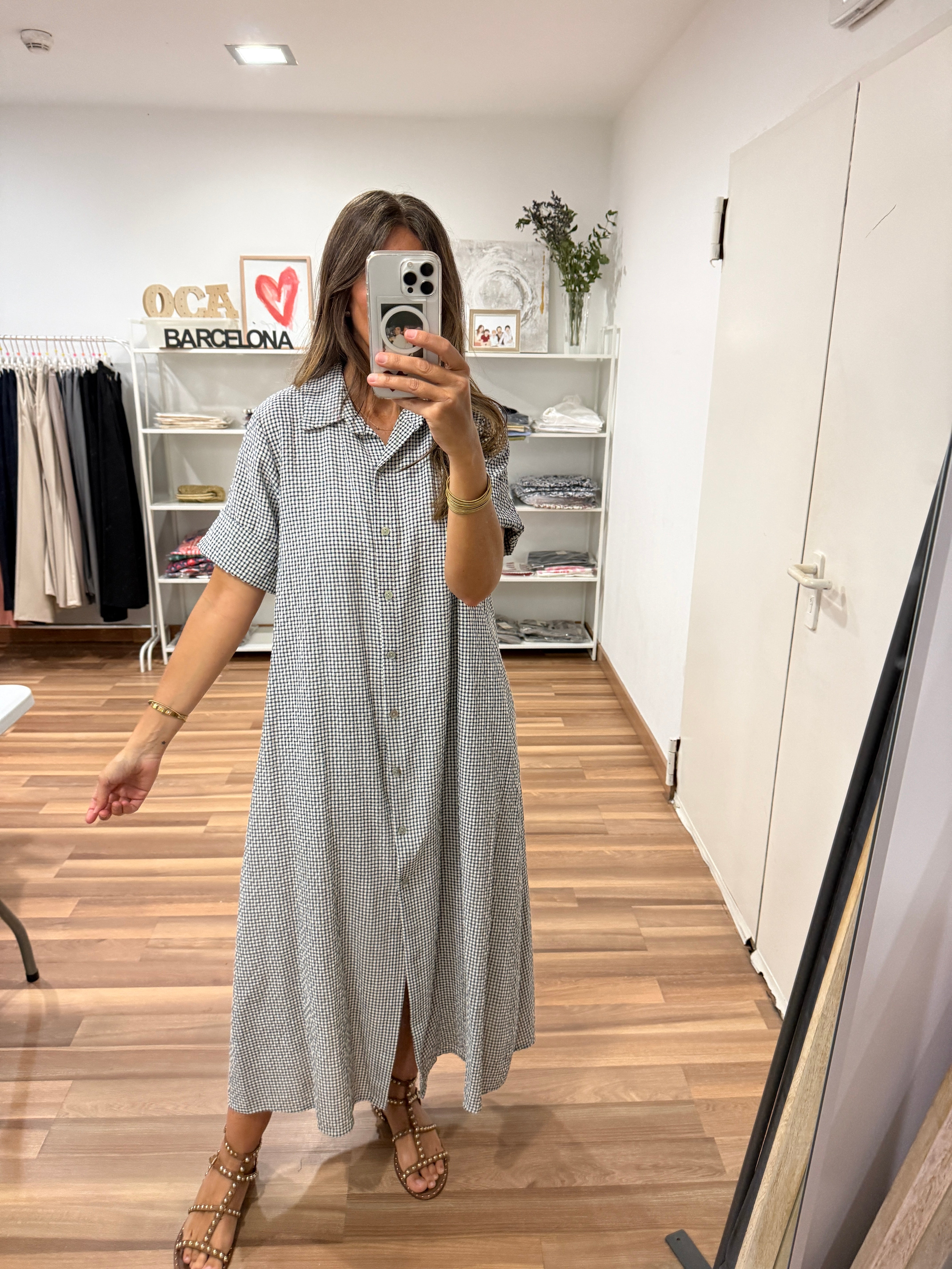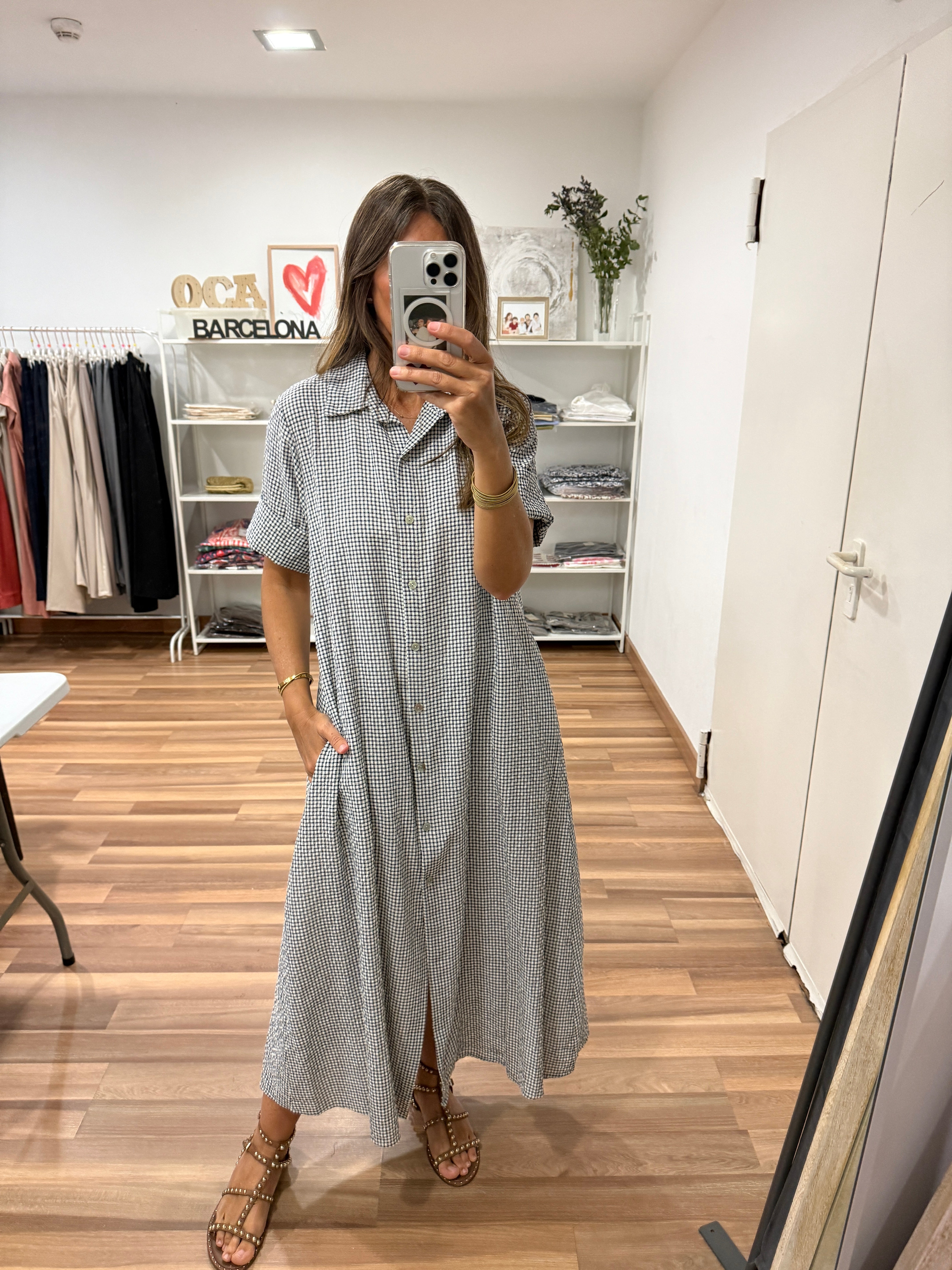 Vestido largo tipo camisero con estampado Vichy. Abotonado con bolsillos laterales y manga corta.